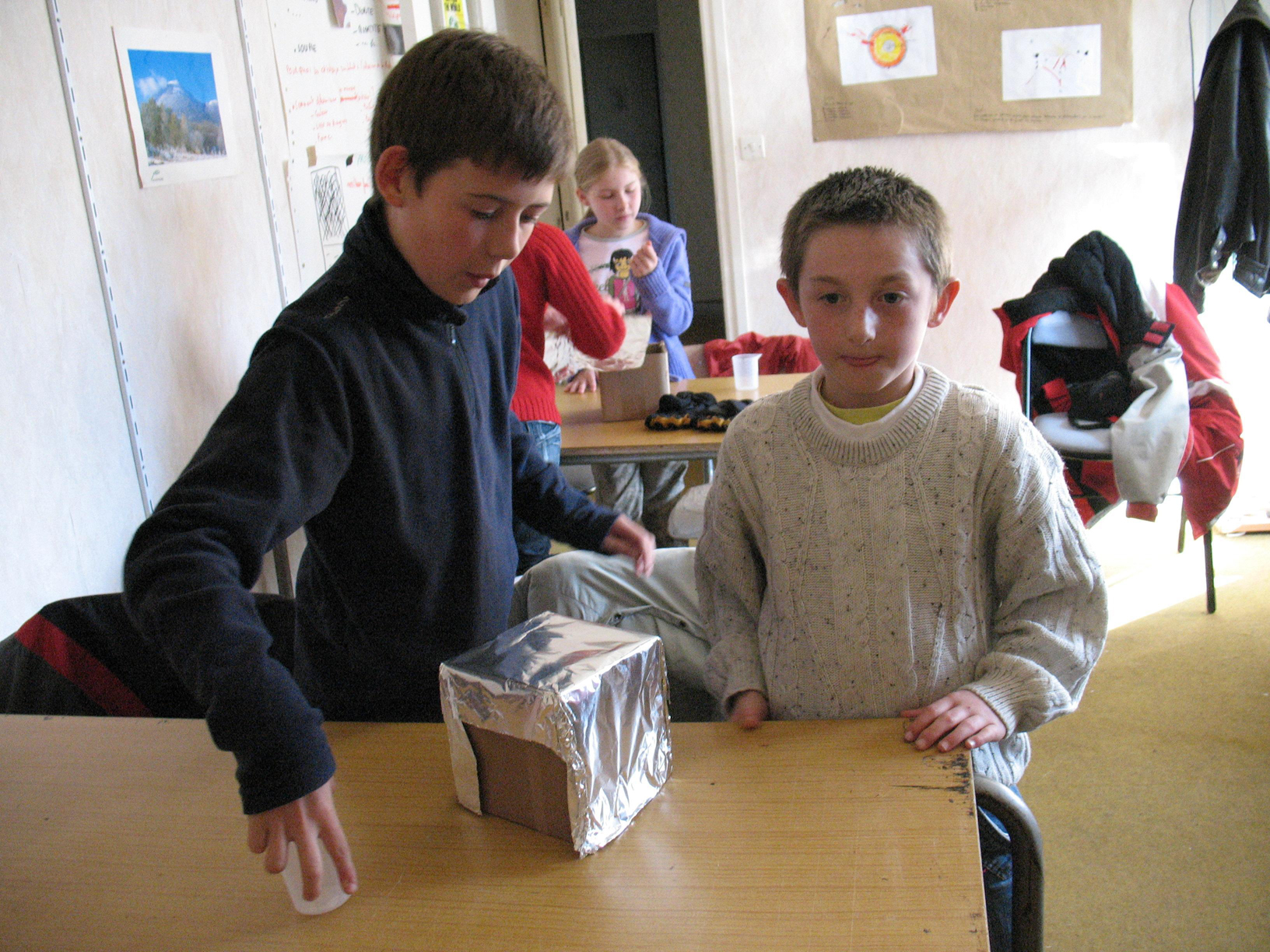 A 16h30, Nous commençons la classe par un petit défi. Il s’agit de réchauffer un verre d’eau grâce à l’énergie du soleil dans une boite en carton. Quatre modèles ont été créés et testés dehors.