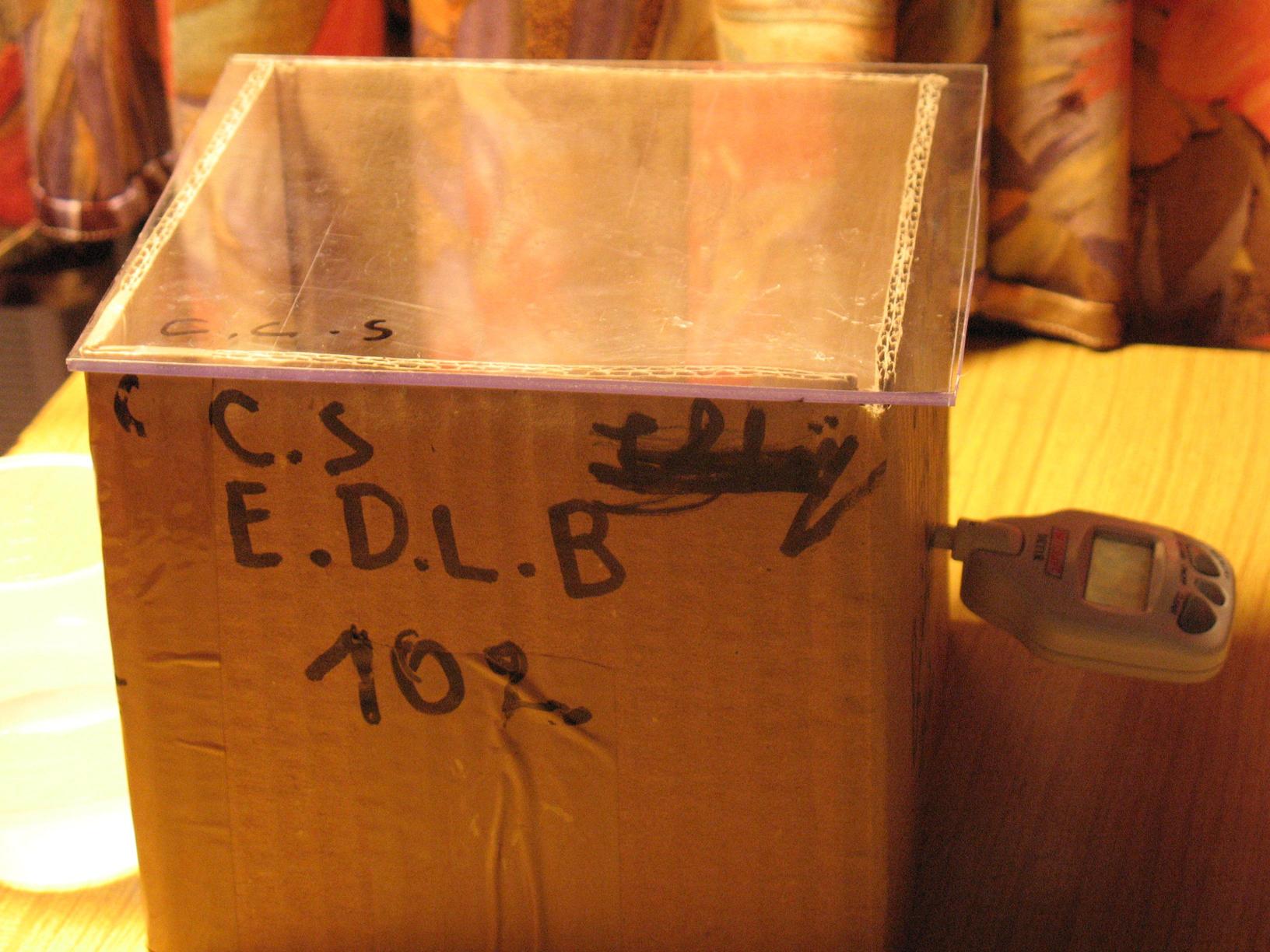 La boite est recouverte d’aluminium sur l’intérieur. Le Seebeck est placé au fond avec une partie vers l’extérieur. Le fond est peint en noir. La boite est aussi munie de réflecteur en aluminium. On fait flotter l’ensemble sur de l’eau pour que le Seebeck soit refroidit. Les résultats montrent que lorsque l’eau est trop froide, cela ne marche pas bien car il ne fait pas assez chaud dans la boite. On est arrivé à faire monter la température jusqu’à 60 degrés. Pour ces 60 degrés il faut que l’eau soit à 10 degrés. On obtient le maximum de volts (0.5 volts).