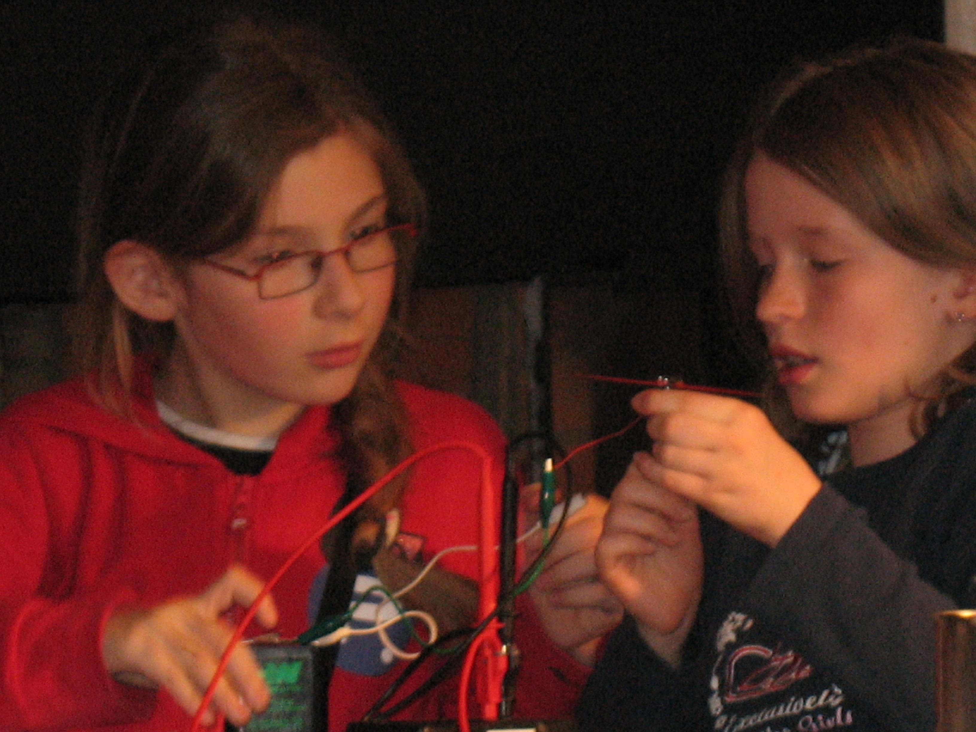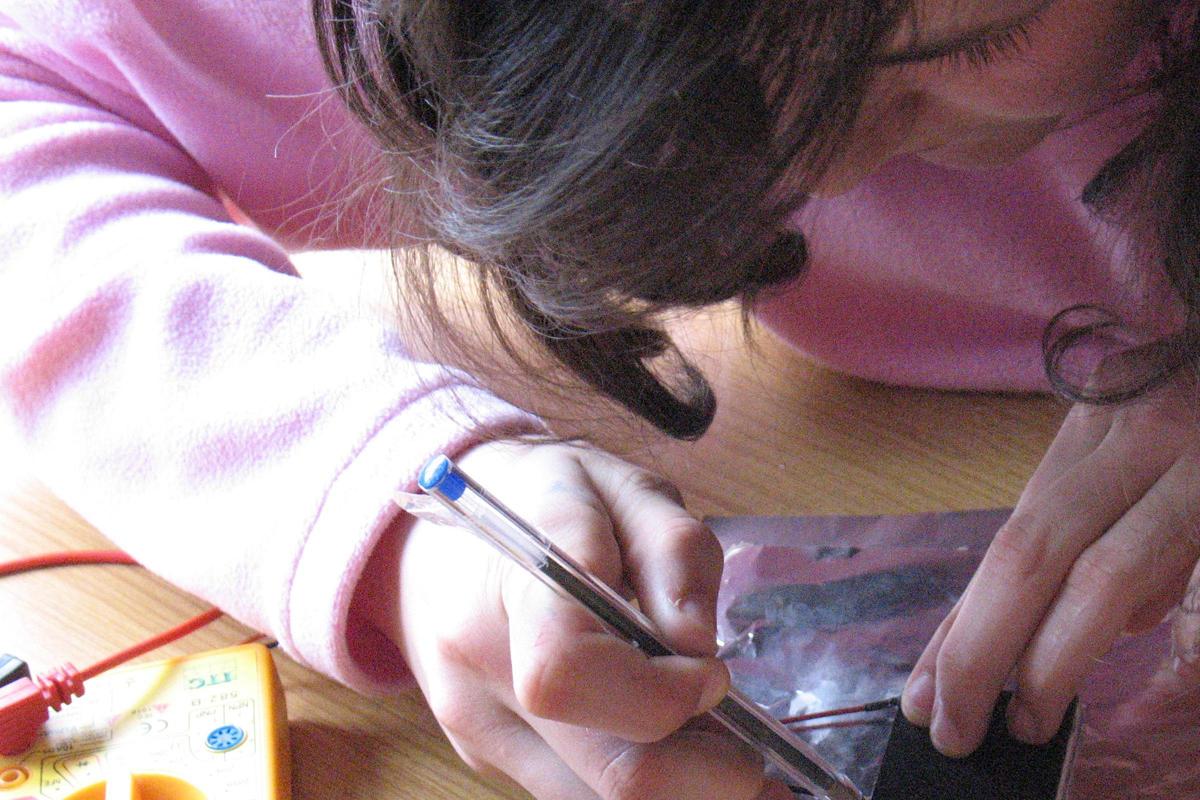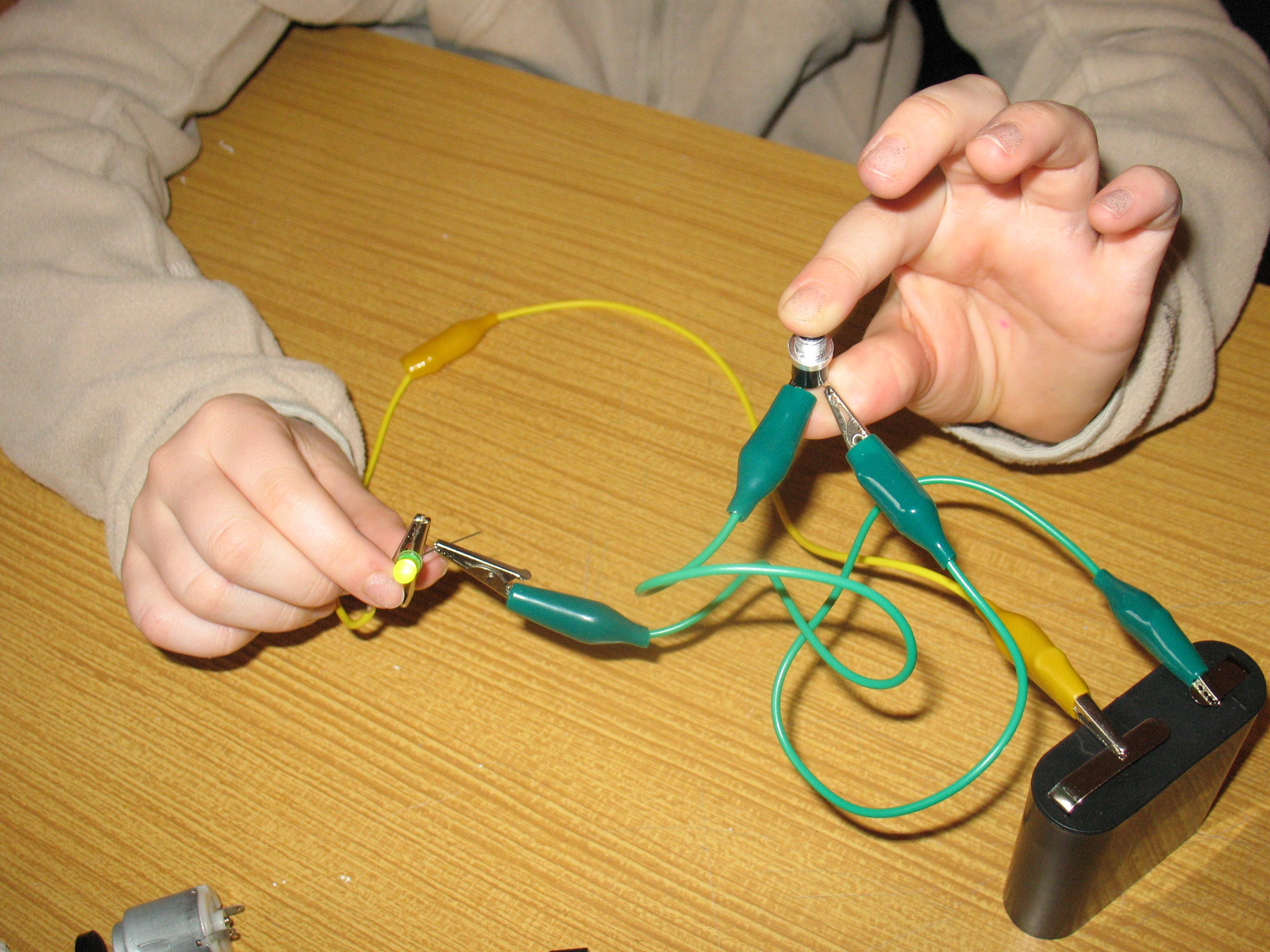 On s’est amusé à éclairer une L.E.D. (une toute petite lampe), faire tourner un moteur, utiliser un interrupteur, sonner un buzzer (petit haut parleur qui produit un son), en les branchant grâce à des fils sur une pile.