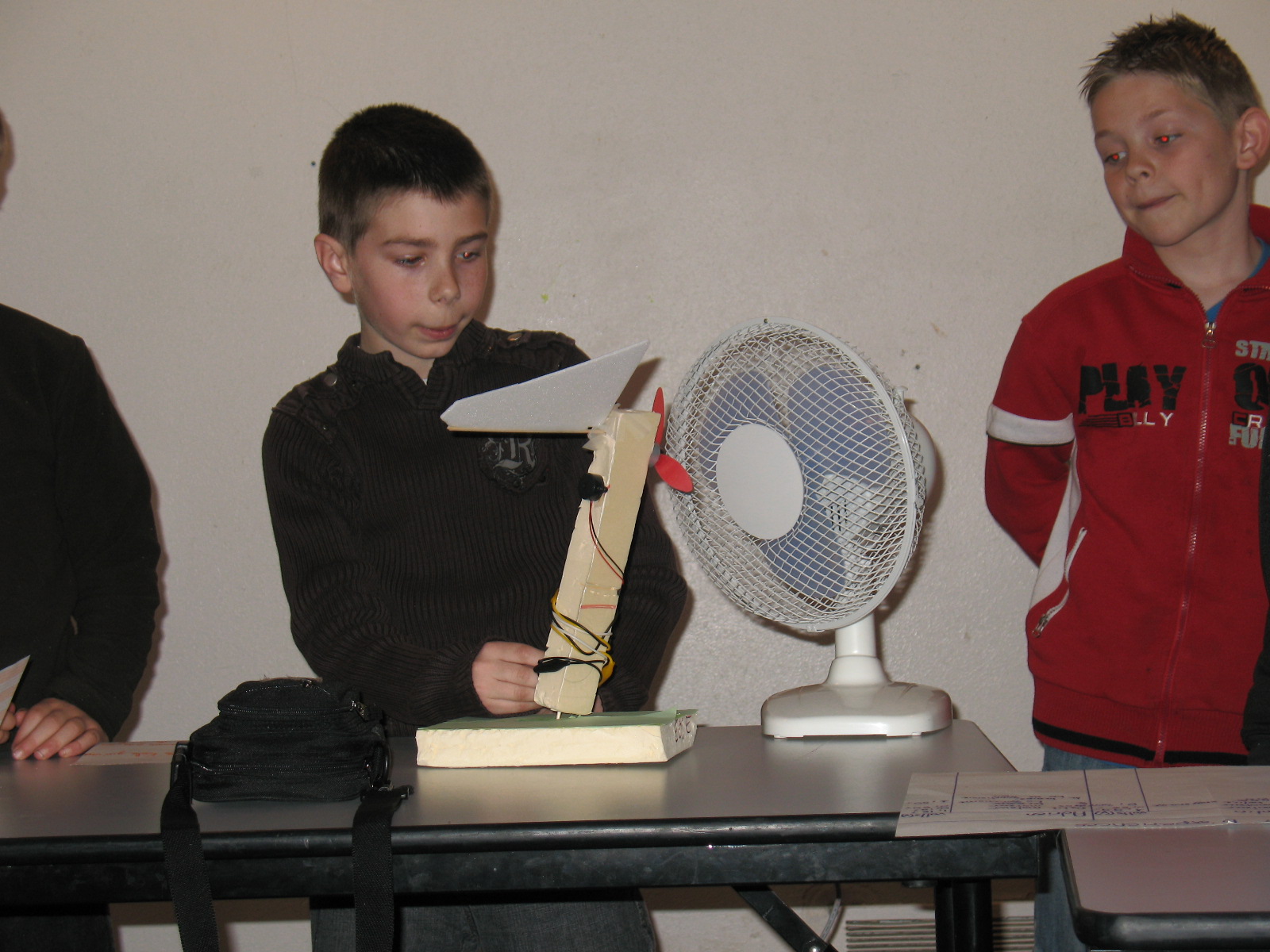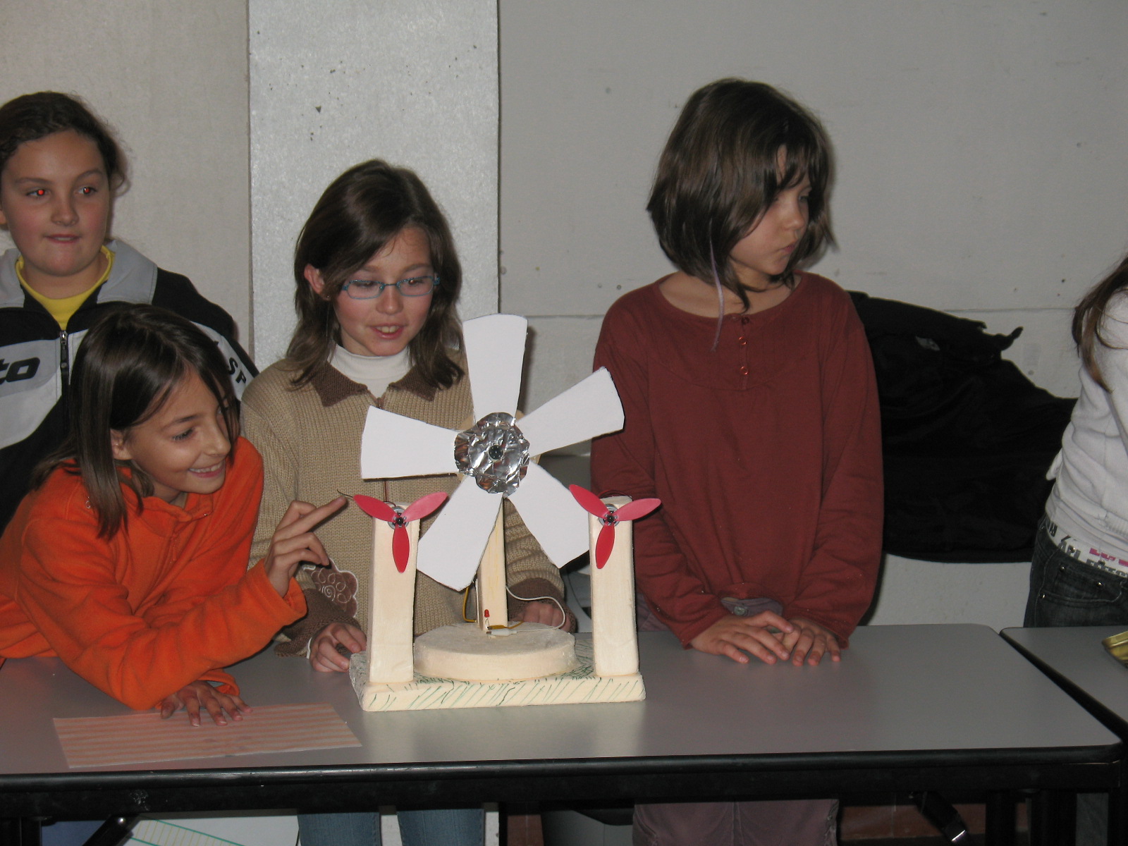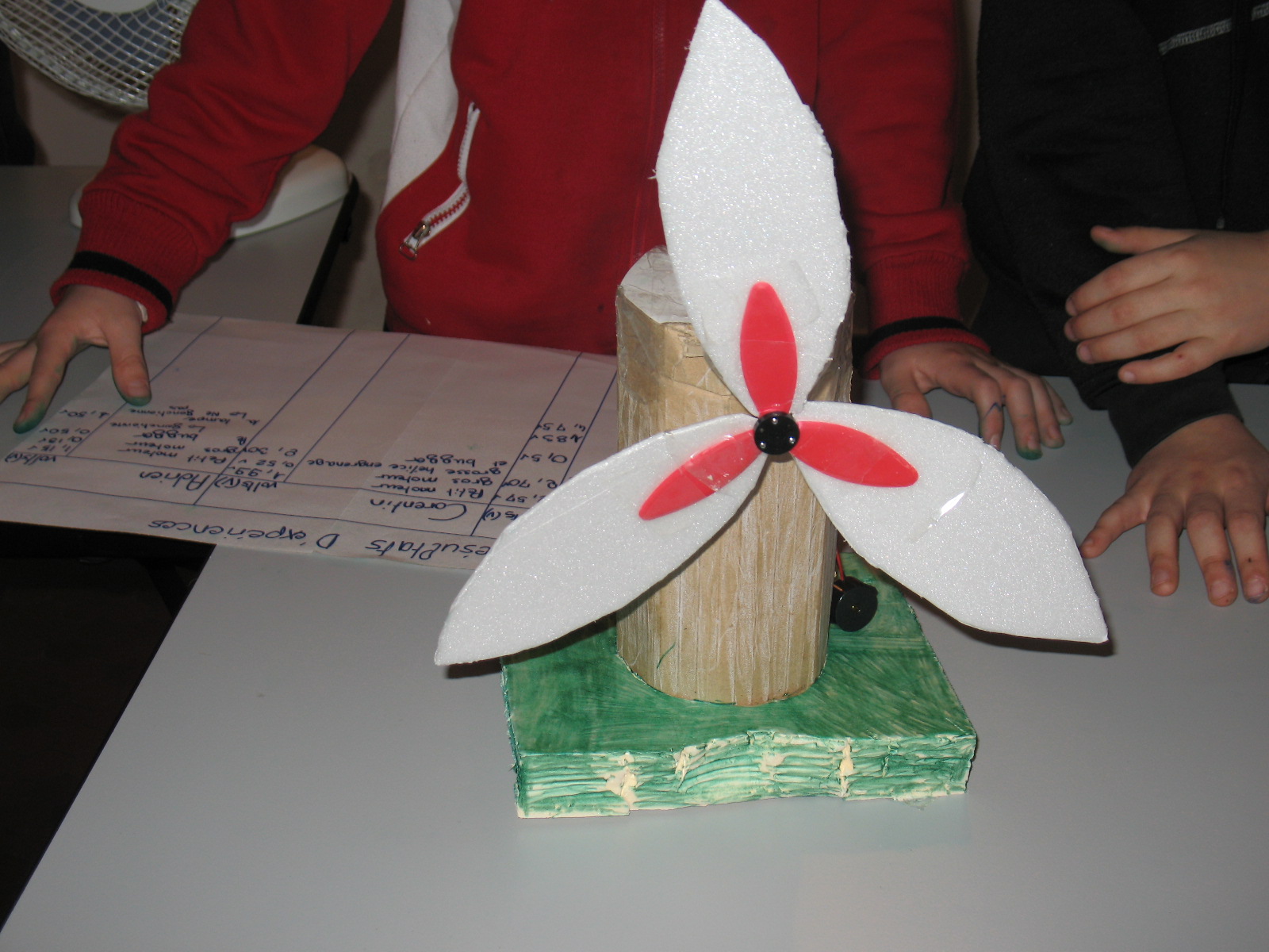 l’éolienne avec une grande hélice à cinq pales et des engrenages qui allume une petite lampe. Au début, nous voulions associer plusieurs éoliennes pour produire plus d’électricité, mais le temps nous a manqué pour rendre notre modèle fonctionnel.
