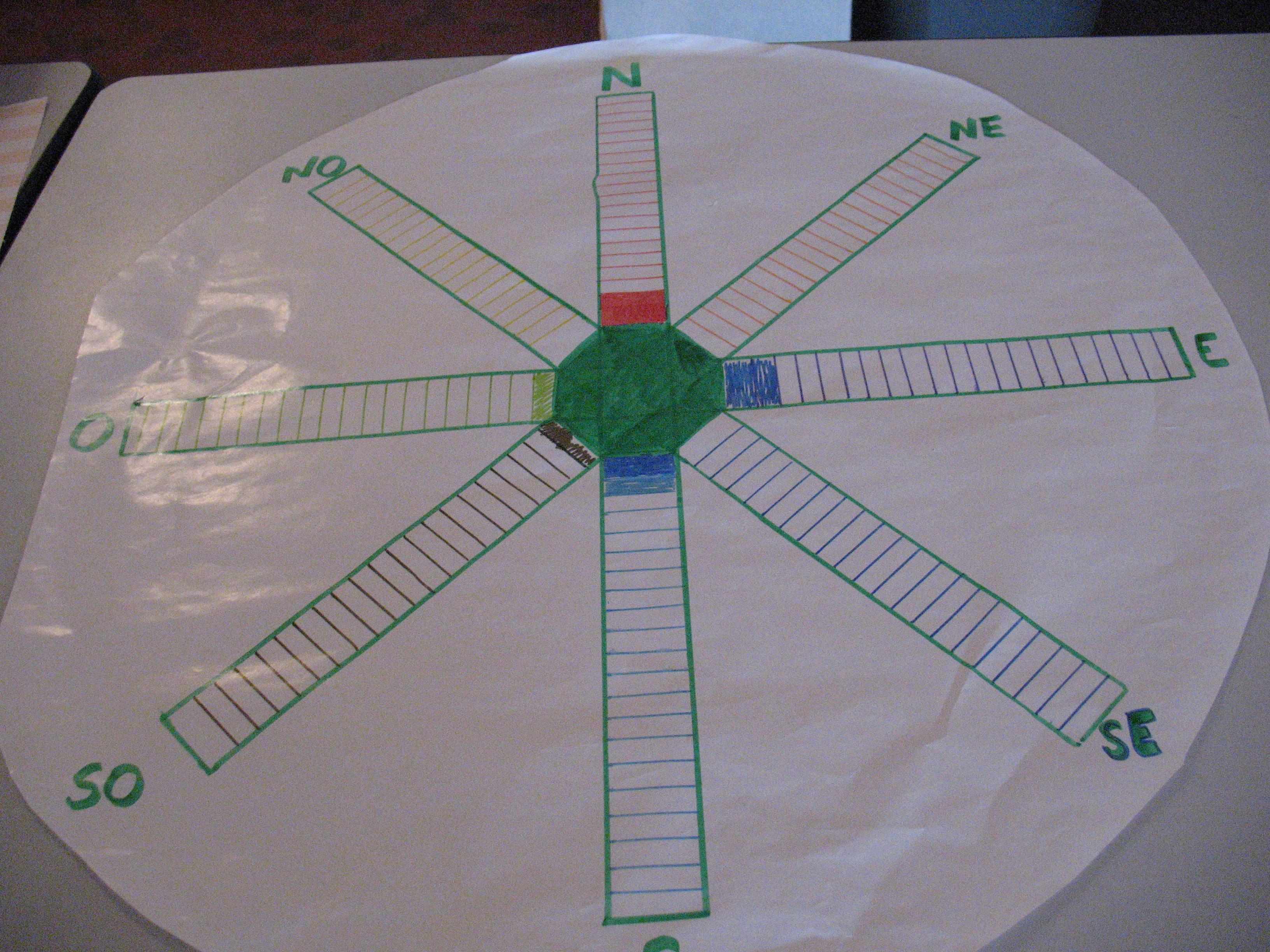 En fait, nous comprenons bien qu’il a ses caprices ! Mais nous allons utilisé une petite technique pour connaître le vent dominant d’un point particulier (près de la station météo). Nous allons utilisé une rose des vents sur laquelle nous écrirons nos mesures !