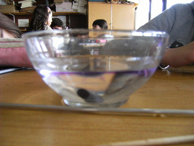 Pour savoir si l’eau chaude était plus lourde, plus légère (ou avait le même poids) que l’eau froide, nous avons pris deux récipients. Le premier contenait l’eau froide, le second l’eau chaude à laquelle nous avons rajouté du colorant. A l’aide d’un petit tube de plastique, nous avons pris un échantillon d’eau chaude. Nous l’avons ensuite ensuite posé délicatement ce tube au fond du récipient d’eau froide. Et là... que constate-t-on ?