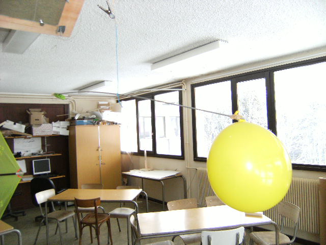 Pour répondre à cette question, il nous a fallu fabriquer une balance équilibrée avec deux ballons de baudruche gonflés accrochés à une tige. Puis, nous avons fixé le dispositif stabilisé (après avoir trouvé son centre de gravité). En perçant délicatement un des deux ballons, nous avons pu constater (ou non !) que la balance se déséquilibre petit à petit au profit du ballon plein.