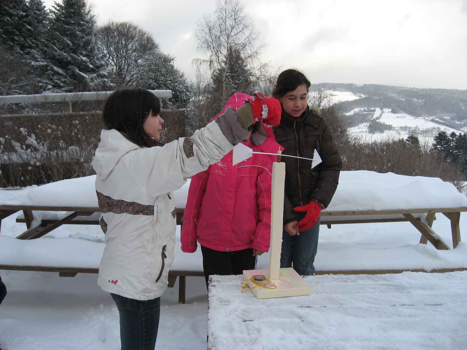 Malheureusement pour nous, le vent était tellement fort aujourd’hui que nos girouettes ont eu de la peine à tenir, pour certaines en partie envolées dans des tourbillons de neige ! Quelques photos :