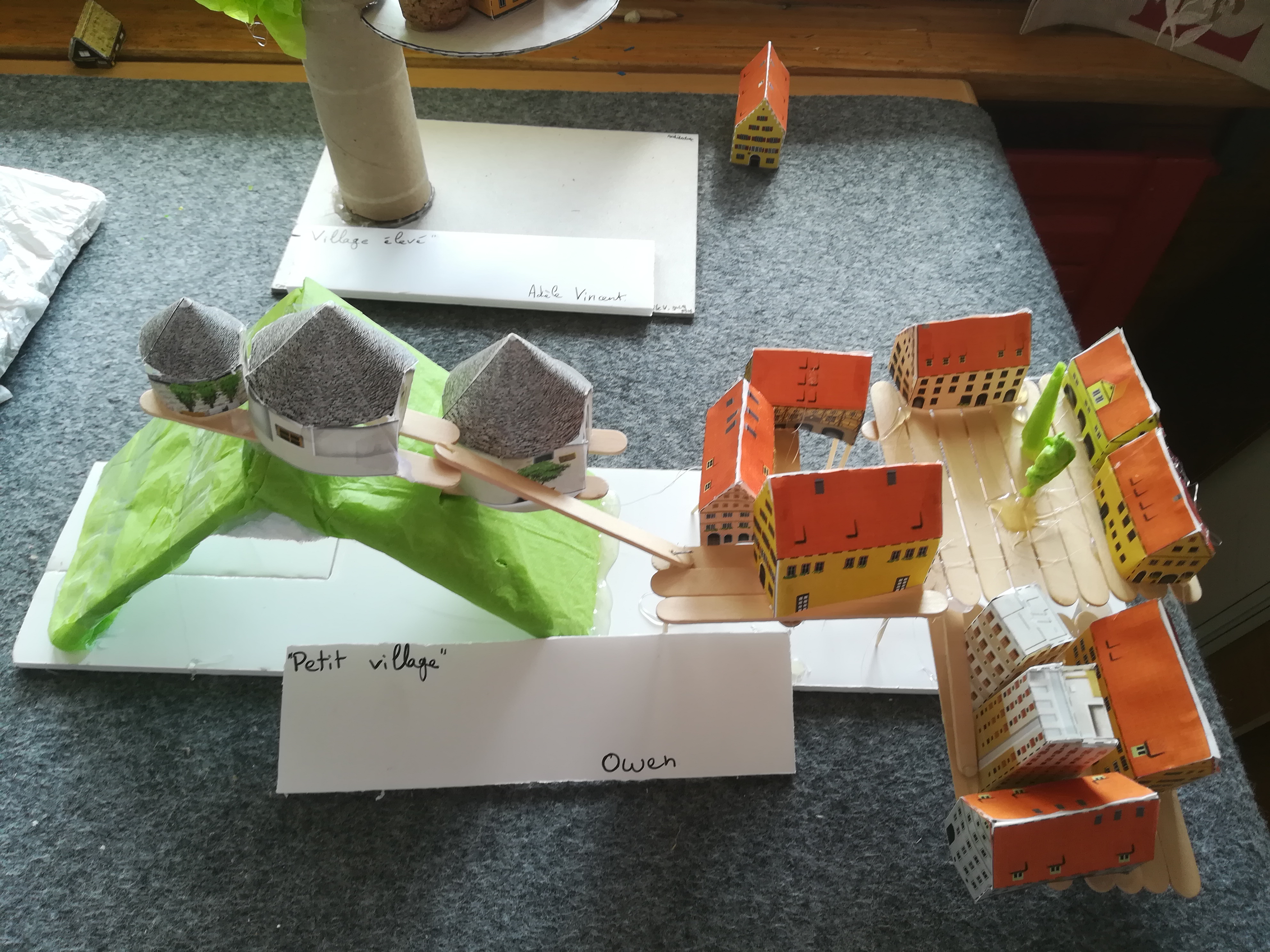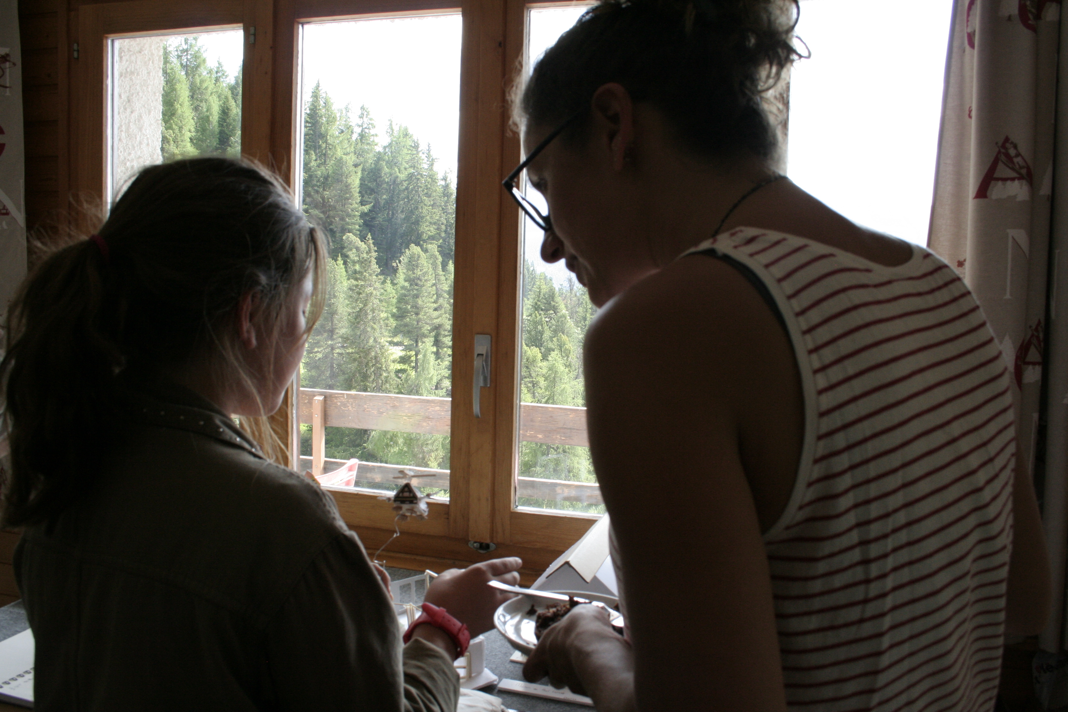 Nous avons produit de nouvelles maquettes personnelles, nous avons fait un « brainstorming » pour identifier un lieu dans le village de Chandolin qui convienne à tous les habitants de notre village du futur et avons commencé à réfléchir à l’implantation respective des habitations. Nous avons déjeuné autour d’une salade de pâtes tomate-pesto-mozzarella, une salade de concombres aux graines de courges et une pomme. L,’après-midi, nous nous sommes activés pour préparer nos sacs, en vue du bivouac au bord du lac du lieu-dit d’Armina.
