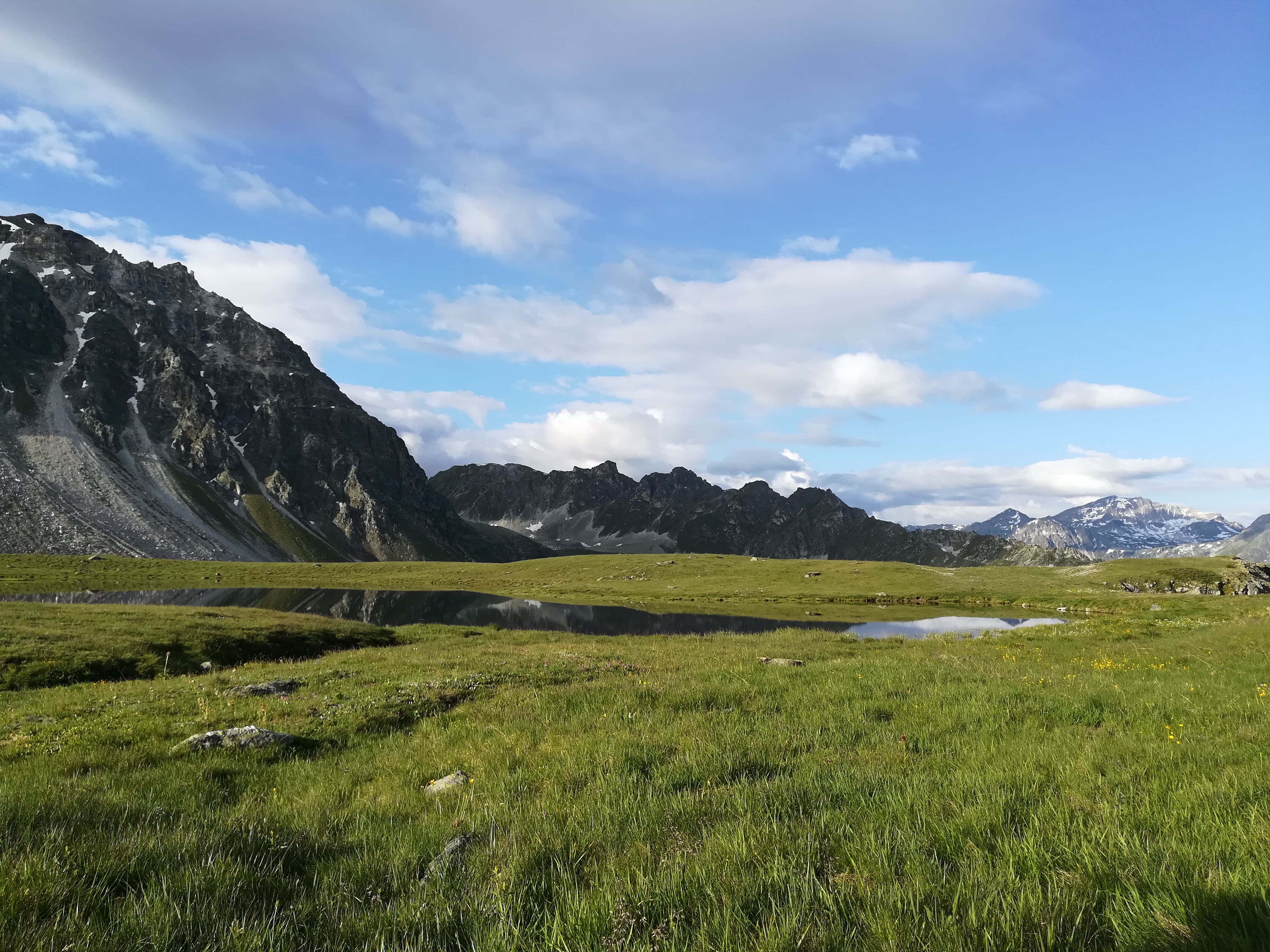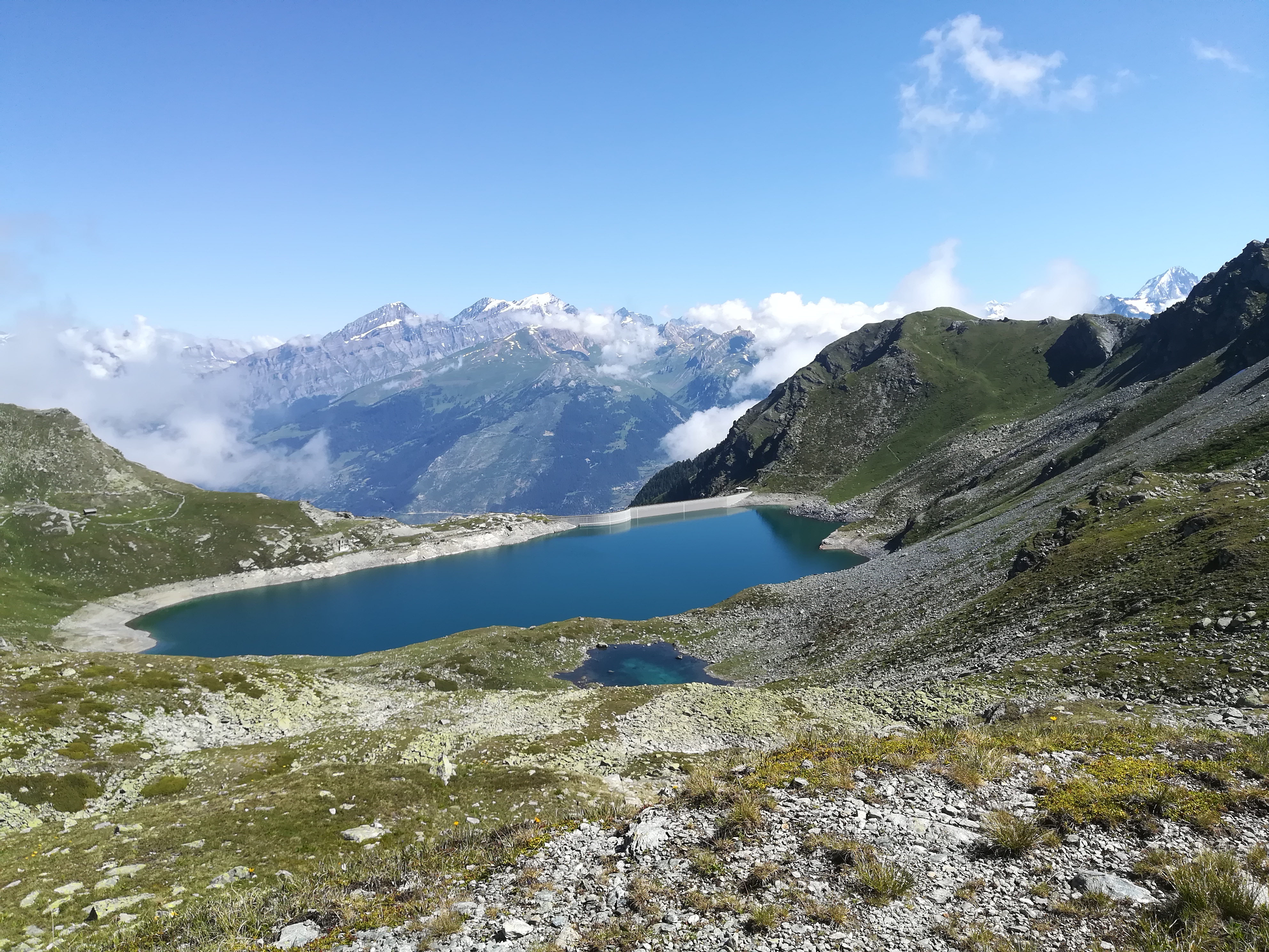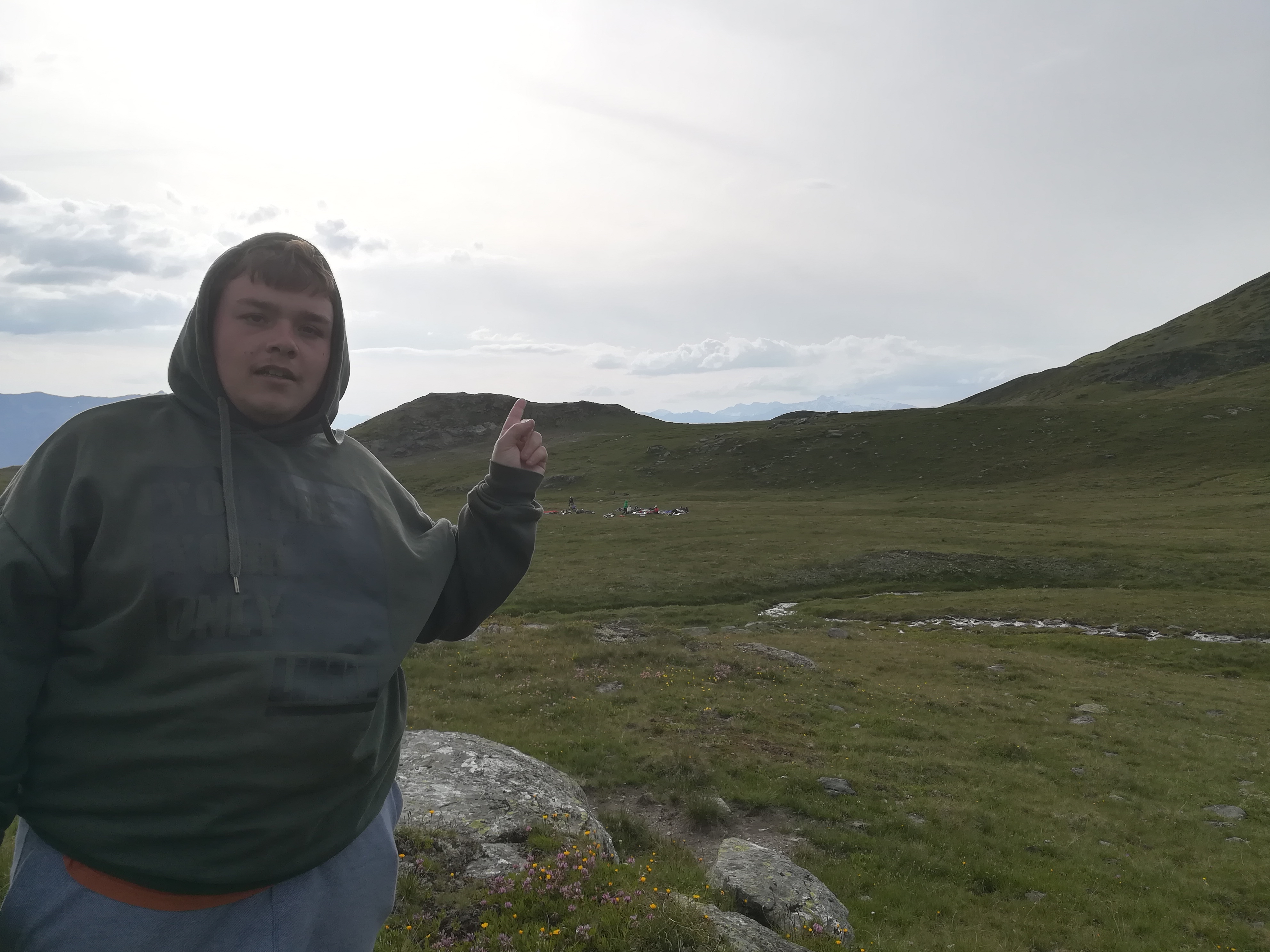 Ce matin, grand beau temps ! Après le petit-déjeuner, nous partons en randonnée pour la journée au-dessus de Chandolin pour étudier les paysages et comprendre les habitats de haute-montagne. Rémy, éducateur multi-talentueux nous accompagne, tandis que Cyril est resté à l’auberge avec Adèle qui souhaite pour sa deuxième semaine de séjour « architectes du futur » approfondir un projet personnel. C’est aussi l’occasion de s’initier à l’aquarelle. Nous prenons donc le télésiège, situé juste au-dessus de notre auberge pour monter au Tsapé. Nous empruntons le sentier de la Chénégouga qui forme une boucle de 3,5 km. Nous atteignons le Lac noir (2500 m) où nous discutons avec un pêcheur en quête de truites. L’eau, ’un bleu turquoise, n’est pas chaude : 4° C mais nous voyons un baigneur courageux !
