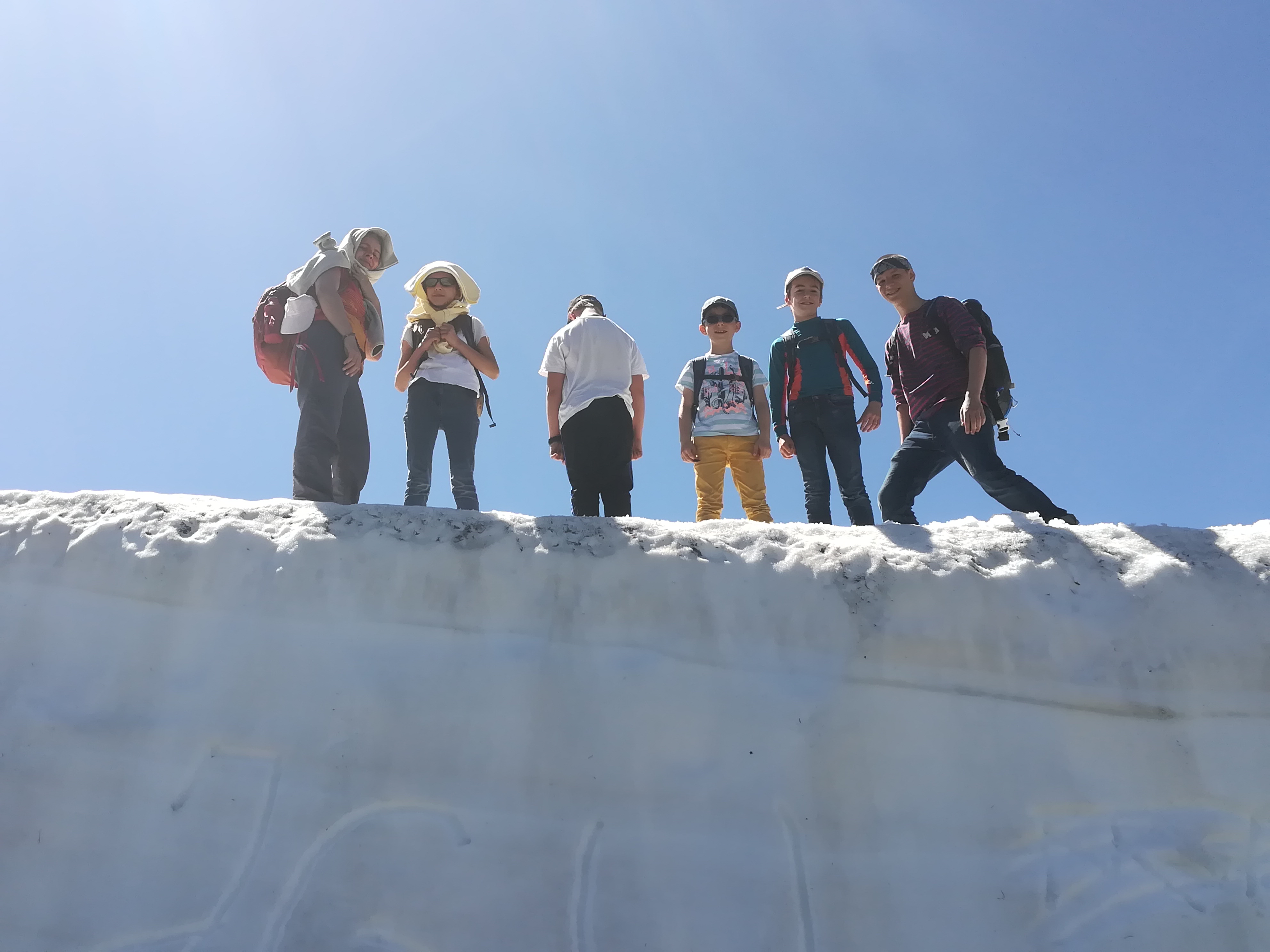 Nous poursuivons notre promenade jusqu’à Illsee (2360 m) d’où nous pouvons découvrir une ancienne étable en pierre et un gîte en bois, fraîchement construit. C’est là que nous décidons de nous arrêter pour déjeuner et dessiner en plein air ce paysage à l’aquarelle qui inspire beaucoup de questions sur comment habiter dans cet environnement. Nous poursuivons le sentier vers un autre lac, plus petit, Wäschsee (2419 m), et atteignons la crête où une plaque de neige est l’occasion d’une photo de groupe ! Nous pouvons observer, avec plus de hauteur encore, la situation de Chandolin et l’implantation des habitations dans le Val d’Anniviers. Nous redescendons vers le télésiège où nous goûtons, avant de retrouver l’auberge des Choucas. Temps de calme créatif pour continuer à explorer la technique de l’aquarelle. Puis jeu de la gamelle et de la sardine avec les équipes « à l’affût de la biodiversité » et « astronomie » revenues également de randonnée. Une belle journée, avec de belles couleurs sur les joues (l’écran total a bien servi !) et de belles observations pour avancer dans les projets scientifiques !