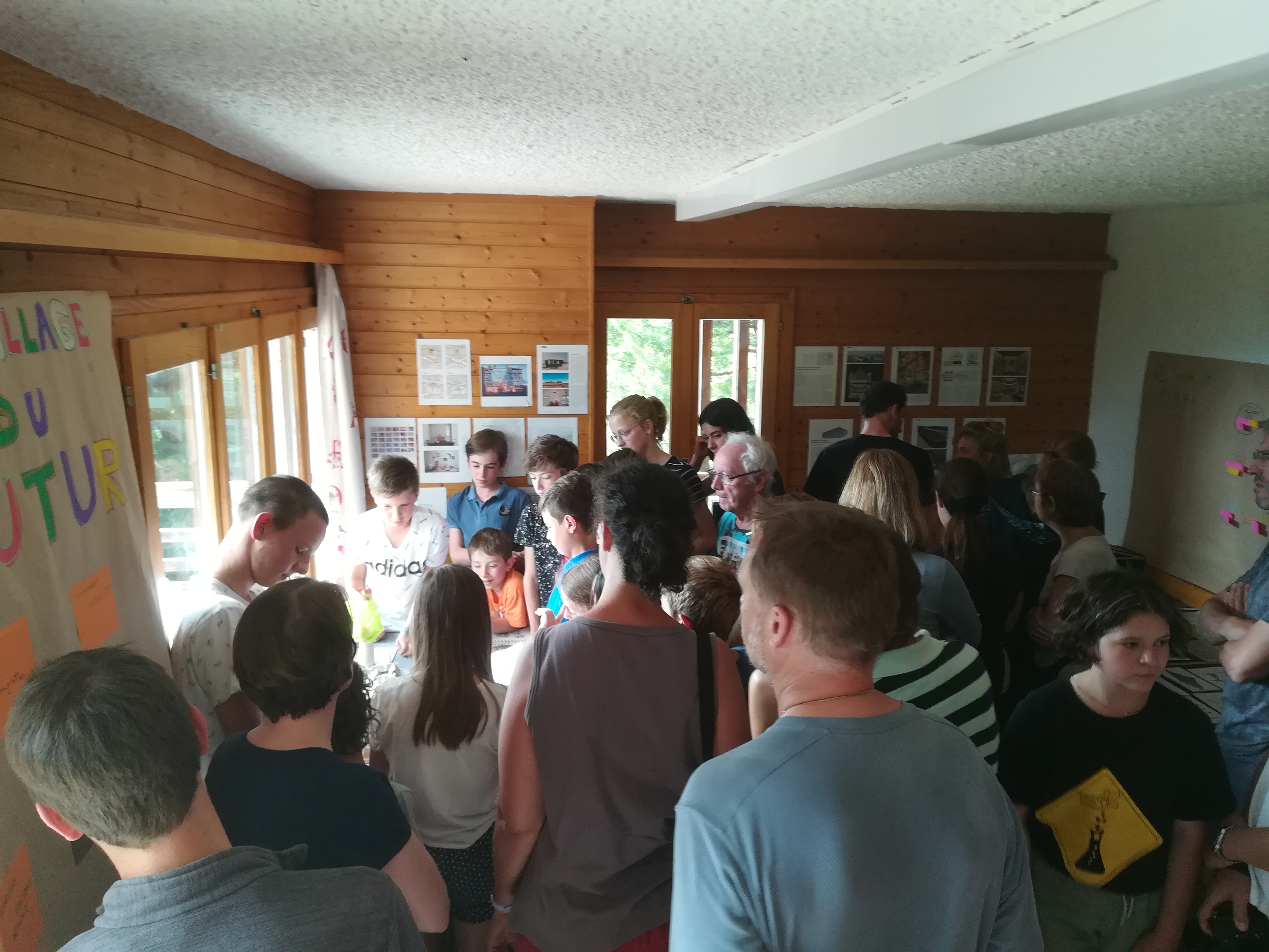 Le soir, nous partageons notre dernier repas autour d’une authentique fondue suisse (originaire de Fribourg). Rémy, l’animateur qui a lancé un défi à chaque camp scientifique toute la semaine : « l’anim’secret story » dévoile l’équipe gagnante : « Nature au sommet » arrive en première place et l’équipe architectes du futur deuxième ! Dernière veillée : une soirée musicale !