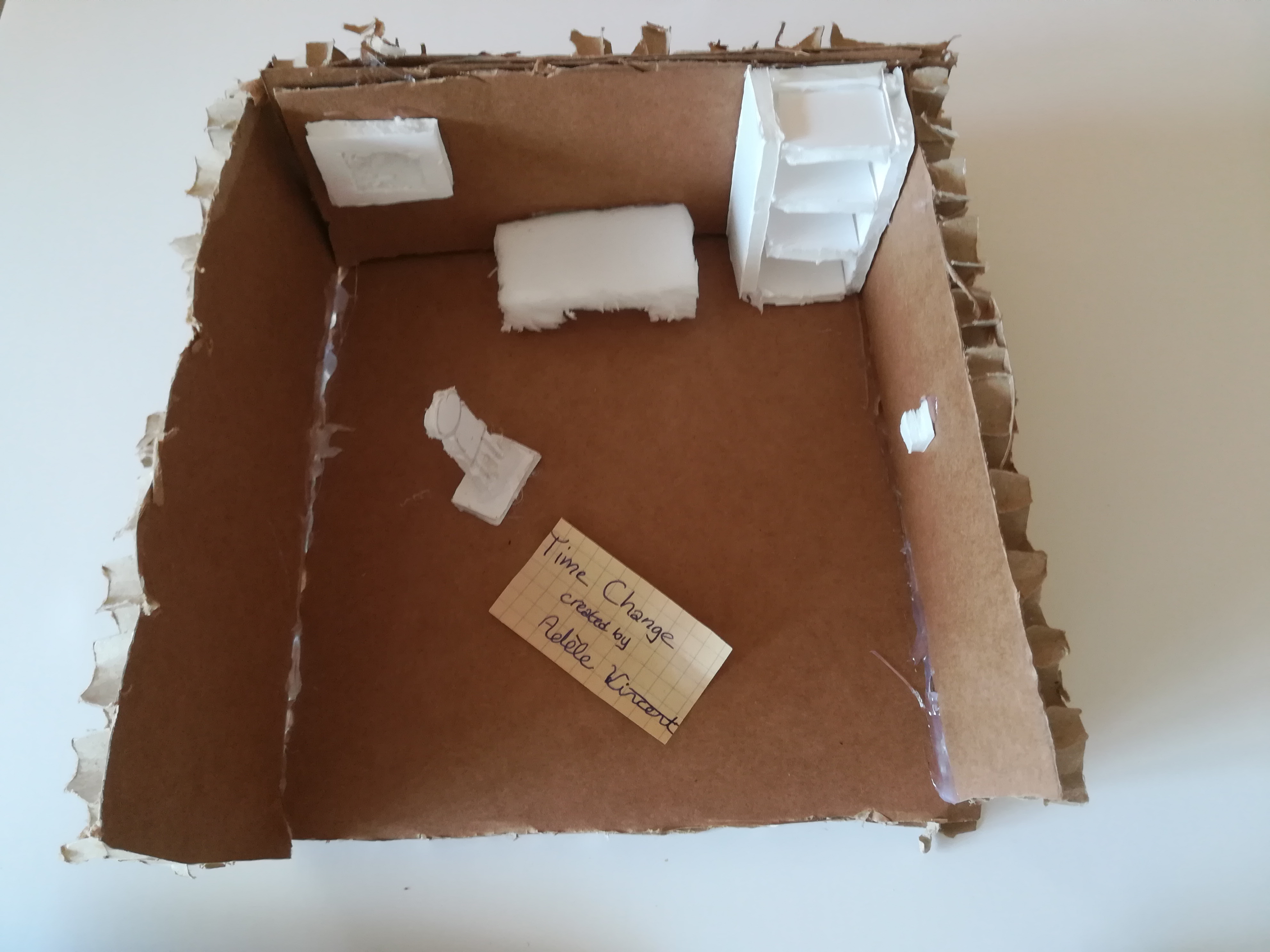 Aujourd’hui nous mettons les mains à l’ouvrage. Avant toute chose, nous familiariser avec les outils dont nous disposons : cutter, ciseaux, pistolet à colle. Chacun fait la preuve de sa compétence et en profite pour affiner sa technique. L’exercice proposé nous permet de réaliser de petites maisons en papier que nous pouvons agrémenter de diverses plate-formes et mettre en situation dans un environnement de notre choix.