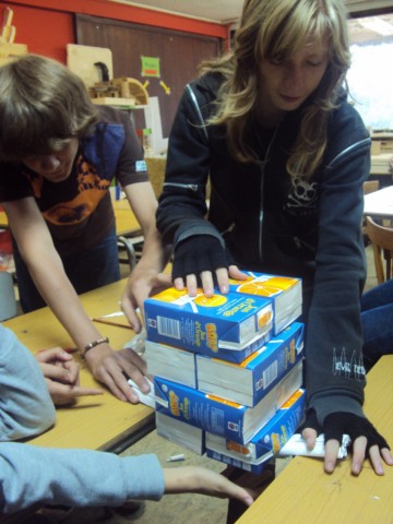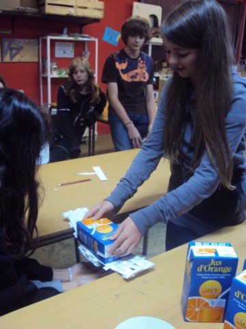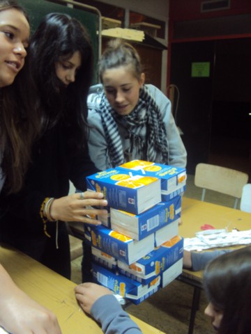 Premier jour d’activités à Prabouré. Le matin nous nous sommes divises en 3 groupes pour faire un pont uniquement à base de rouleaux de papier et de scotch.