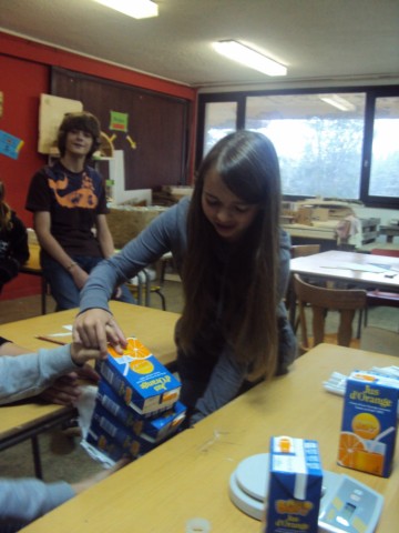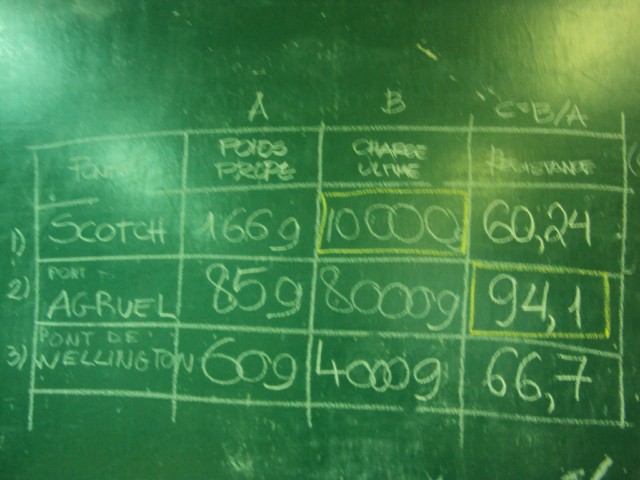 A la fin, on a testé les ponts avec des briques de 1 Kilo. Pour pouvoir compare le pont qui résistait au poids le plus lourd nous fait un calcul :