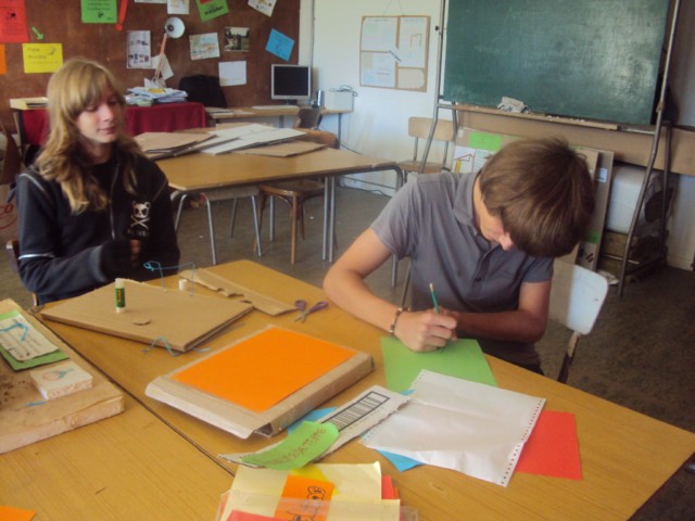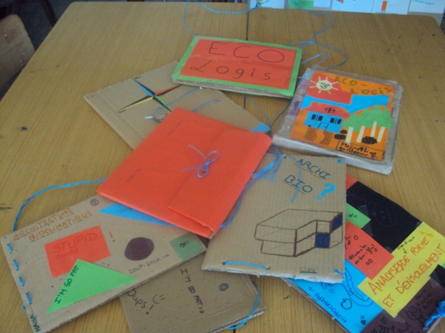 Le matin au début, nous avons fait nos porte-documents (décoration) avec de carton et papier de couleurs.