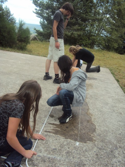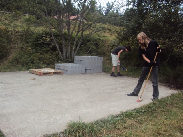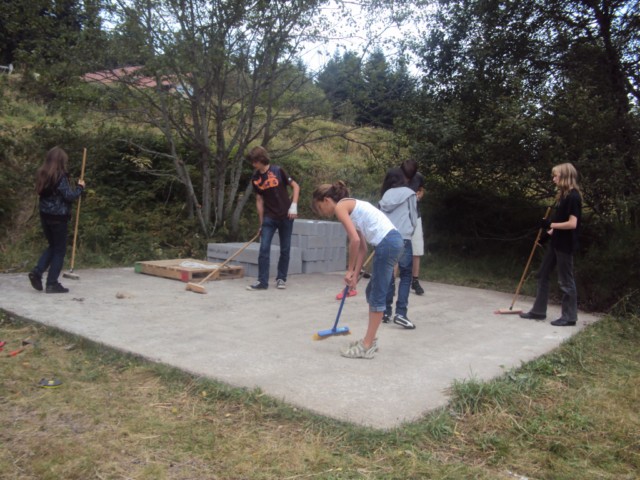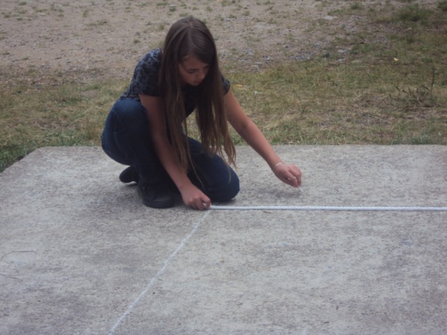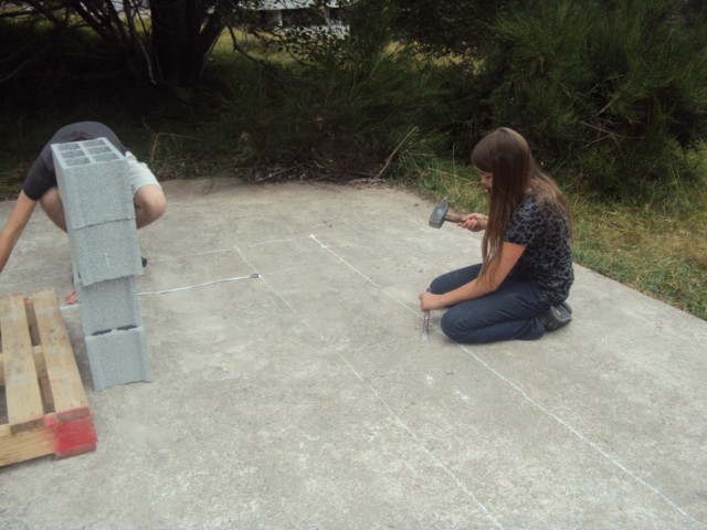 Nous avons d’abord balayé la dalle de béton où va se tenir la cabane puis nous avons tracé les limites avec une craie, une corde et un double décimètre et enfin nous avons fait des trous dans la dalle pour que les fondations tiennent mieux.