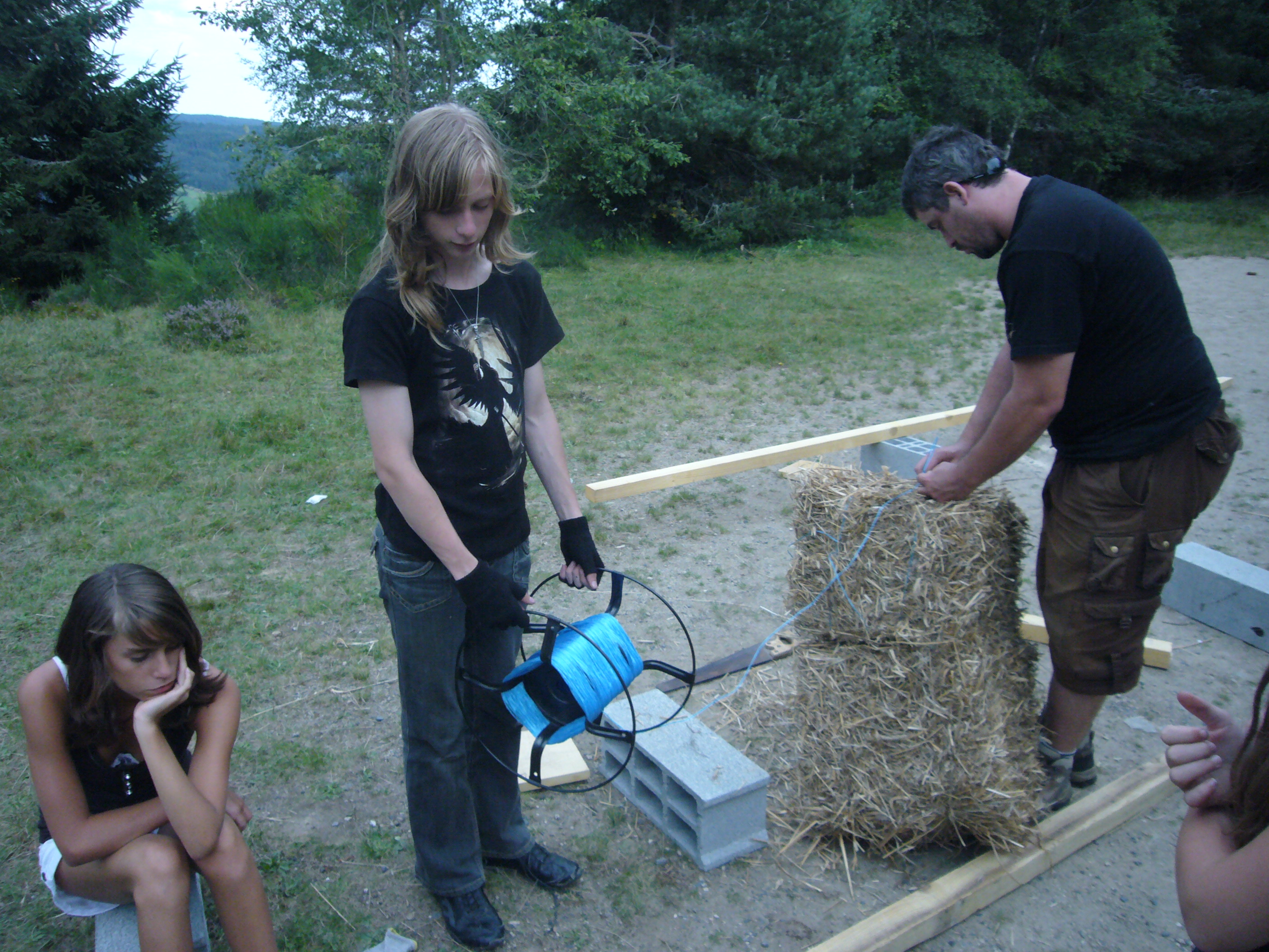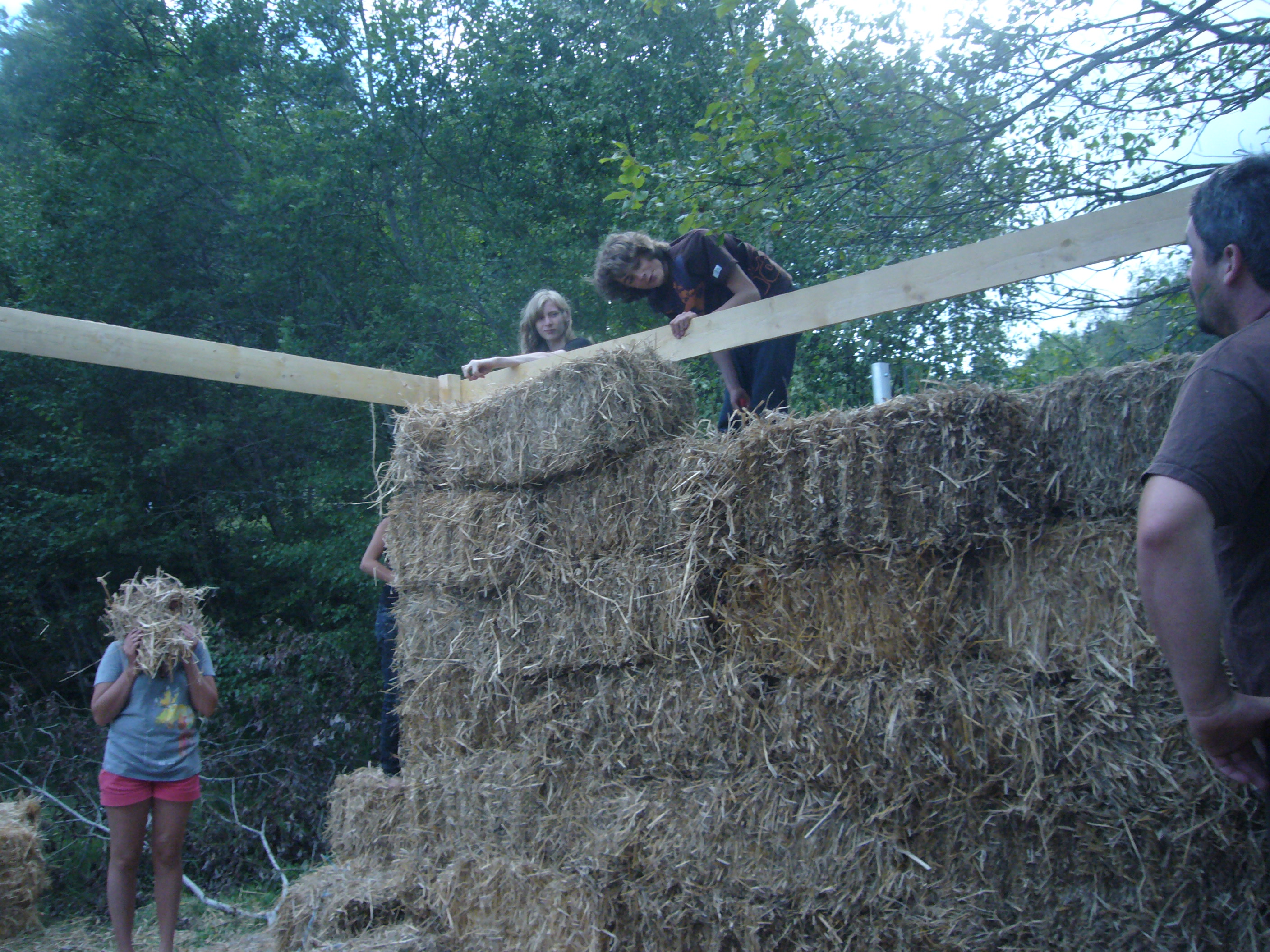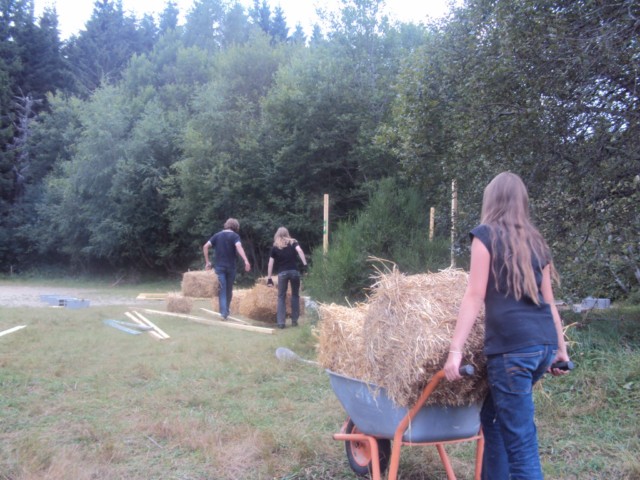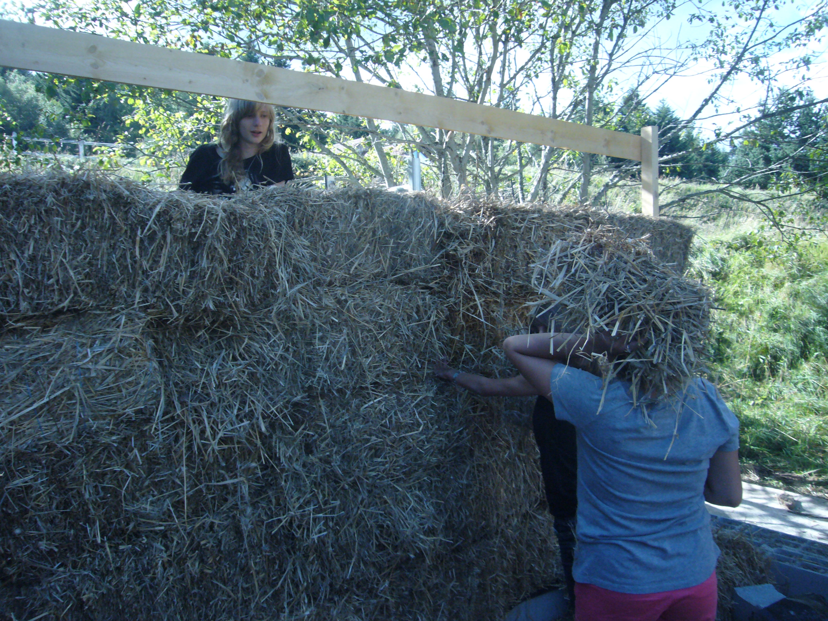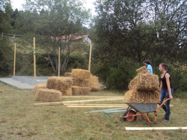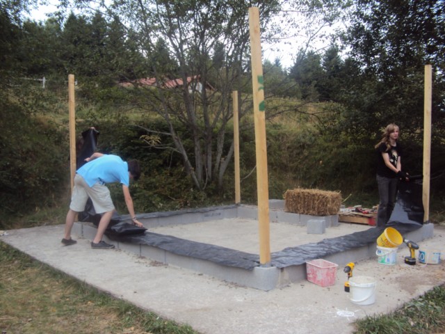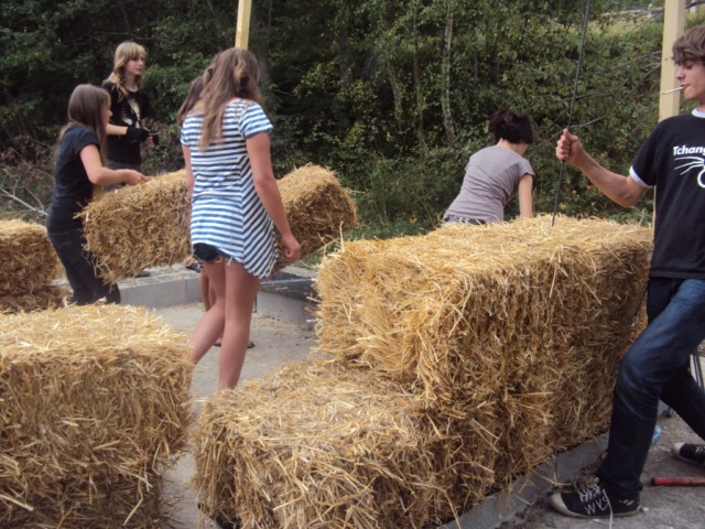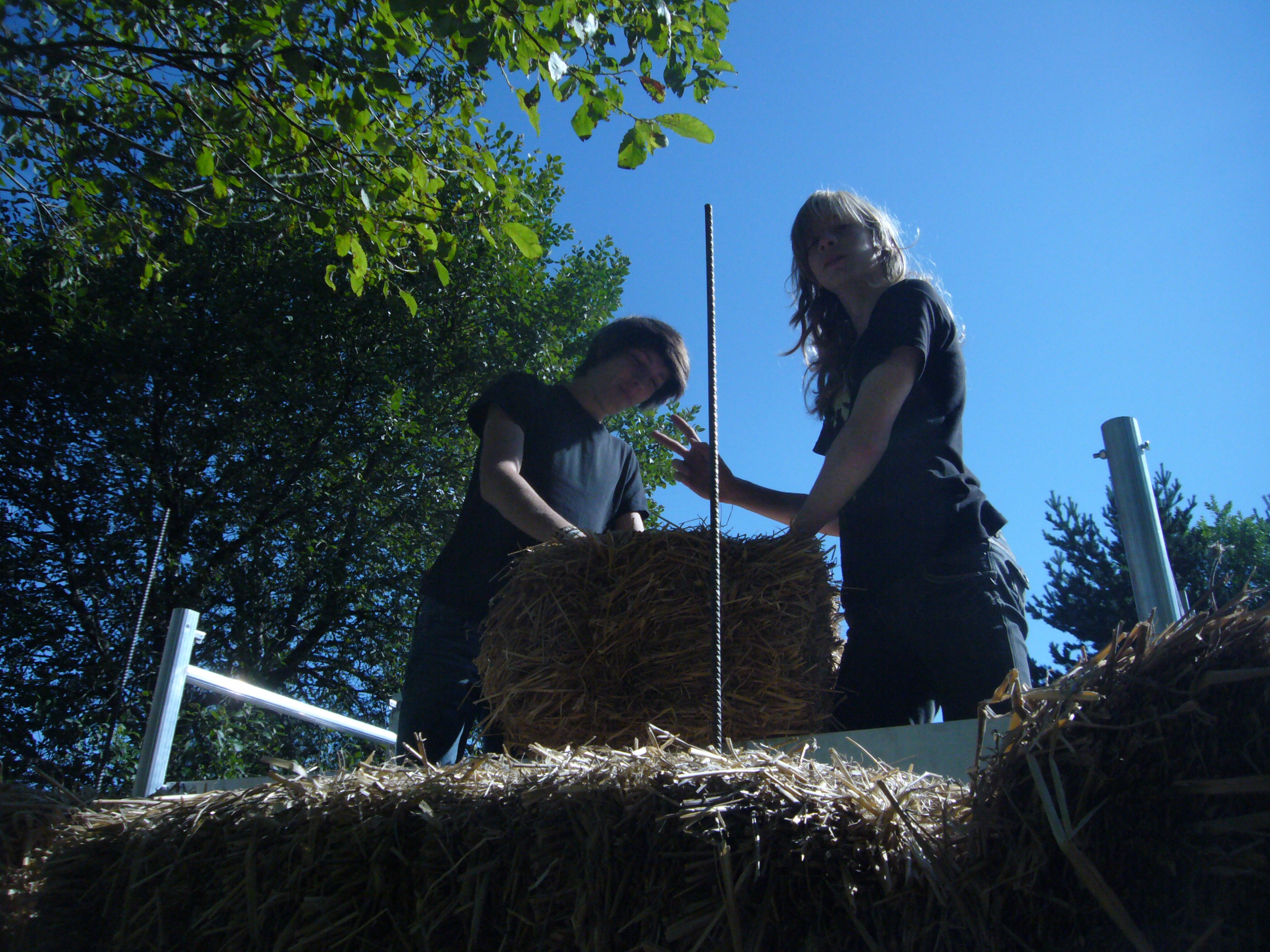 Aujourd’hui, nous avons continué la construction de la cabane : nous avons fini les fondations de béton puis nous avons fixé les poteaux de bois qui seront la charpente, puis nous avons transporté toute la paille qui était dans la piscine jusqu’à la dalle pour monter le premier mur et nous avons planté des tiges de fer dans les ballots de paille pour les fixer ensemble..