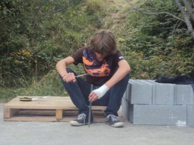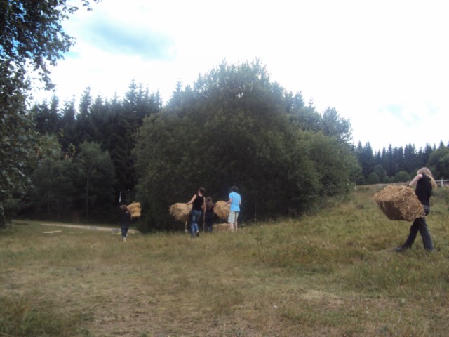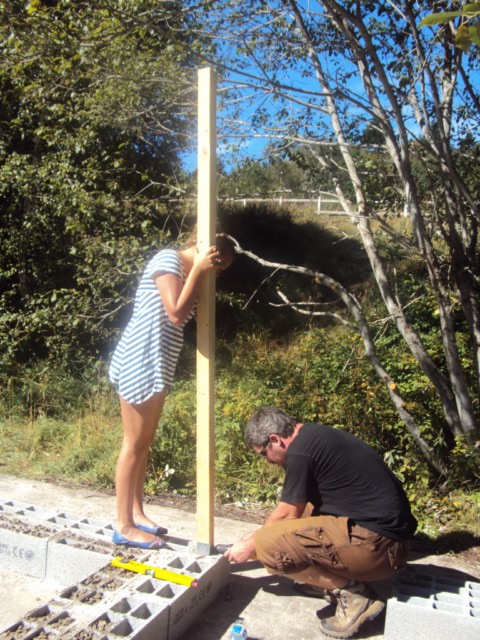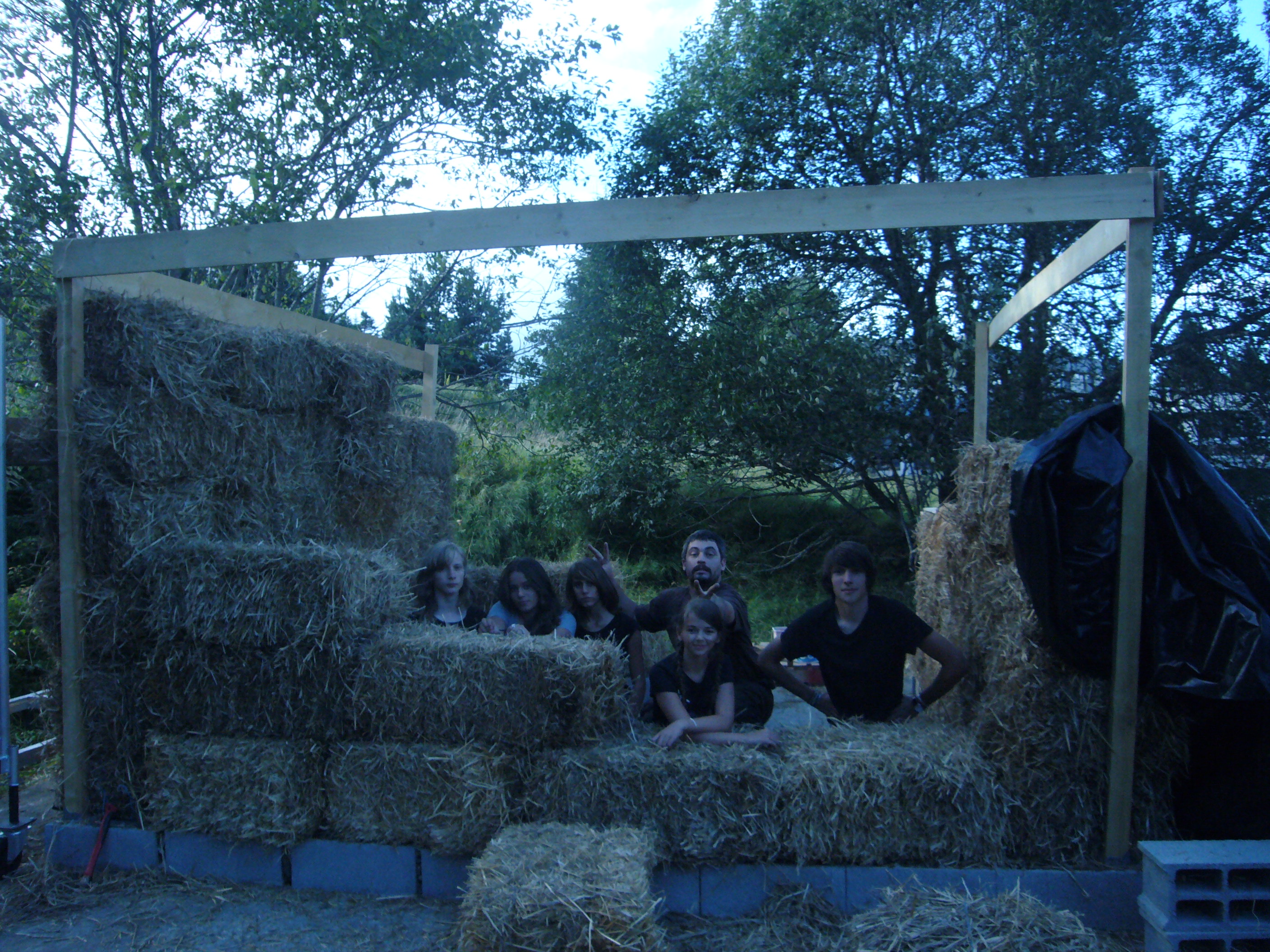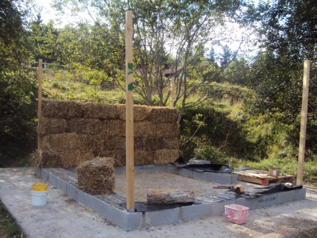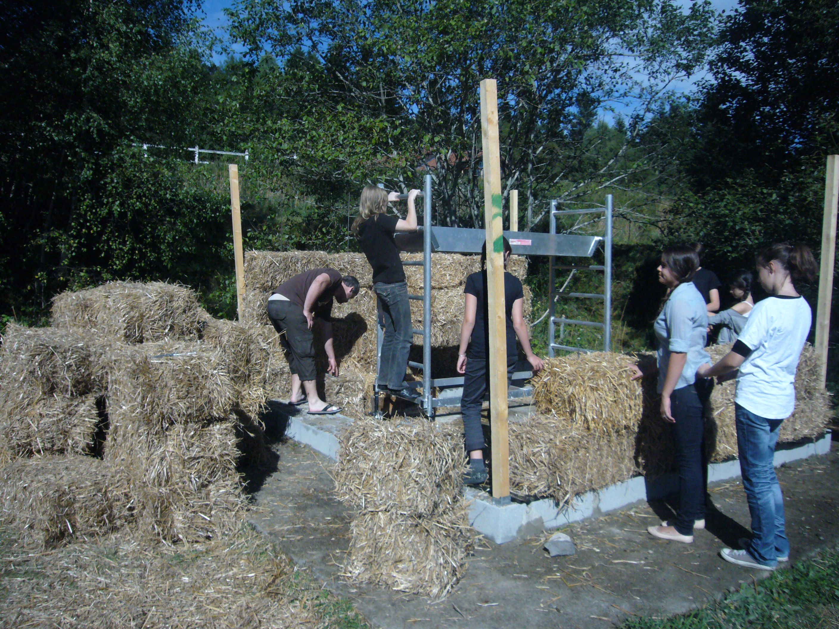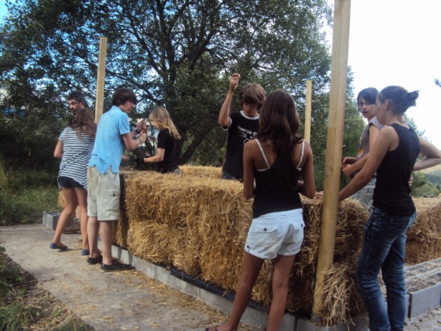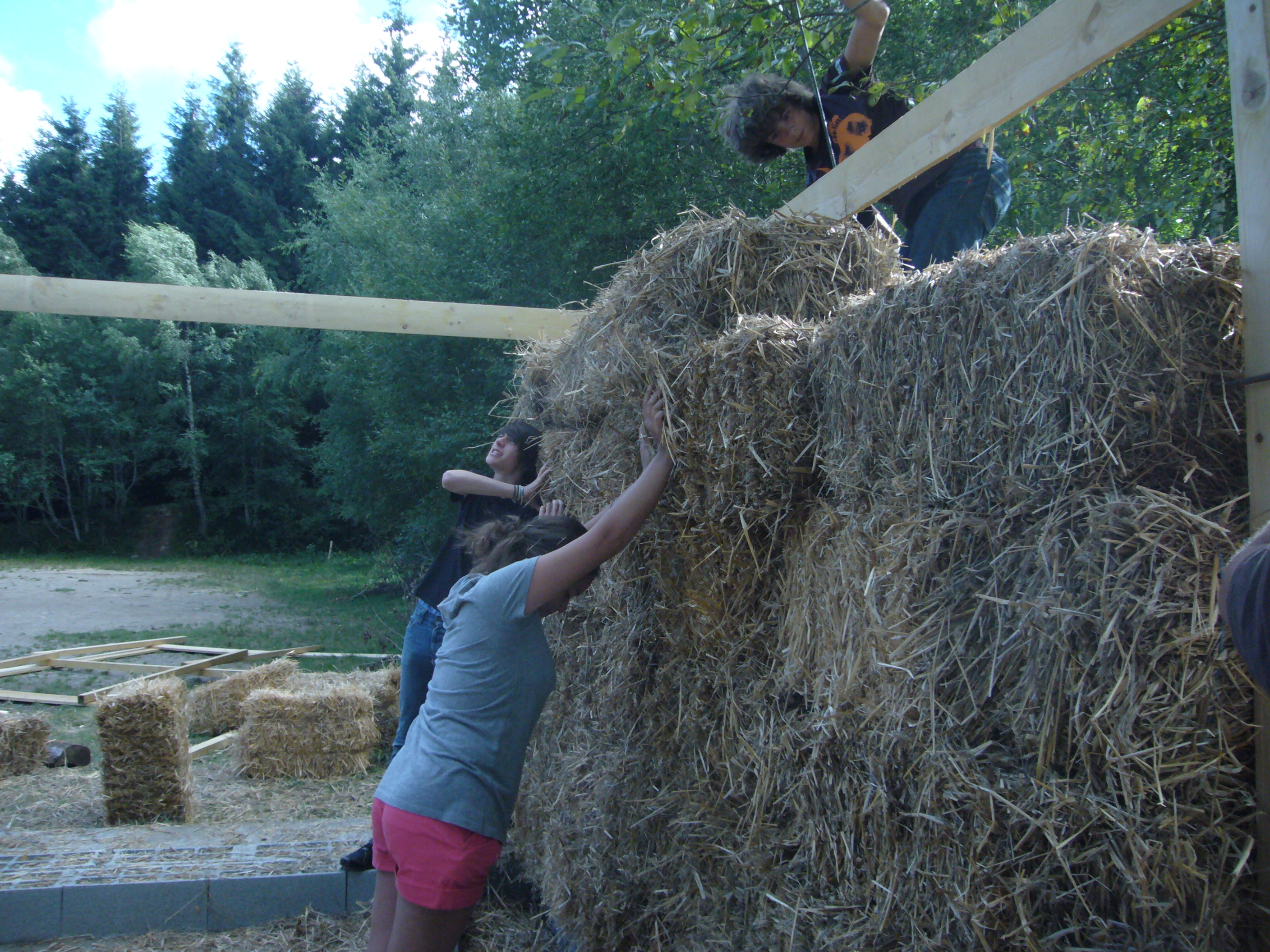 Aujourd’hui, nous avons continué la construction de la cabane : nous avons fini les fondations de béton puis nous avons fixé les poteaux de bois qui seront la charpente, puis nous avons transporté toute la paille qui était dans la piscine jusqu’à la dalle pour monter le premier mur et nous avons planté des tiges de fer dans les ballots de paille pour les fixer ensemble..