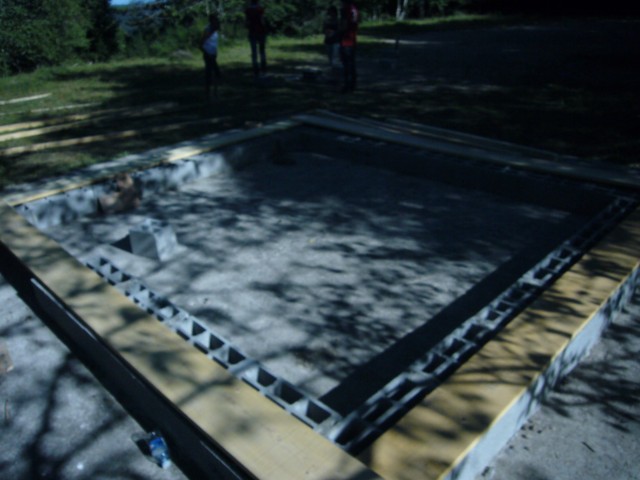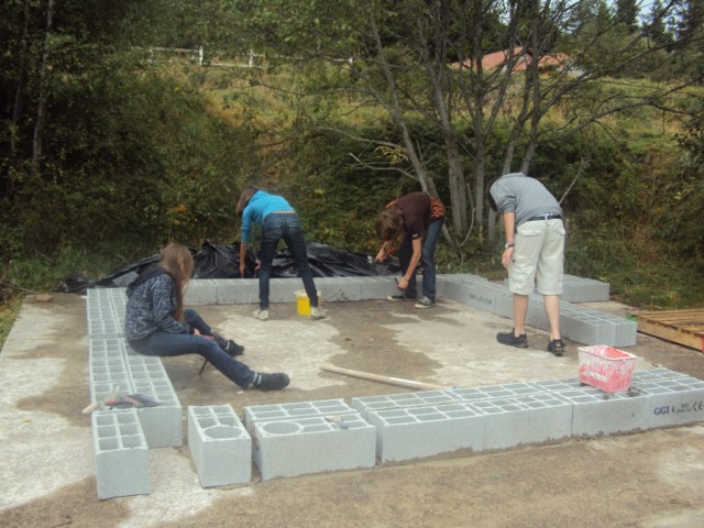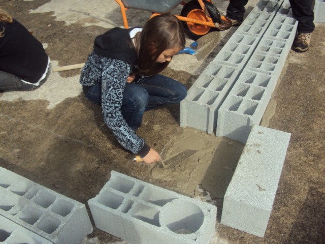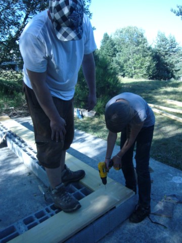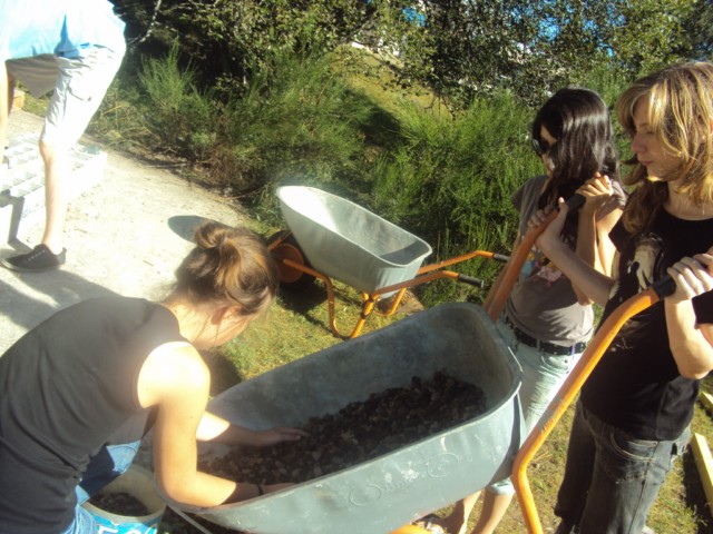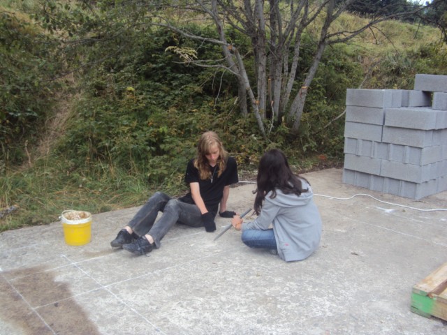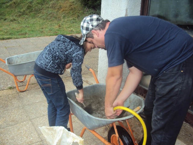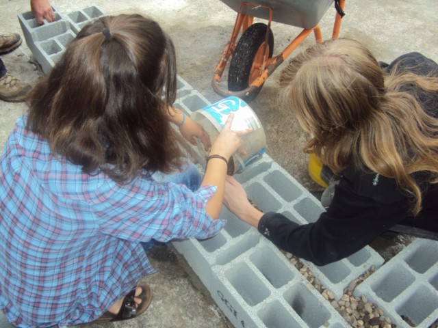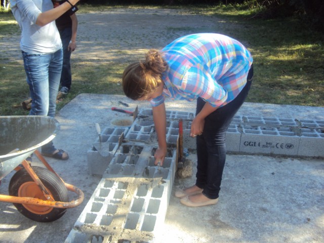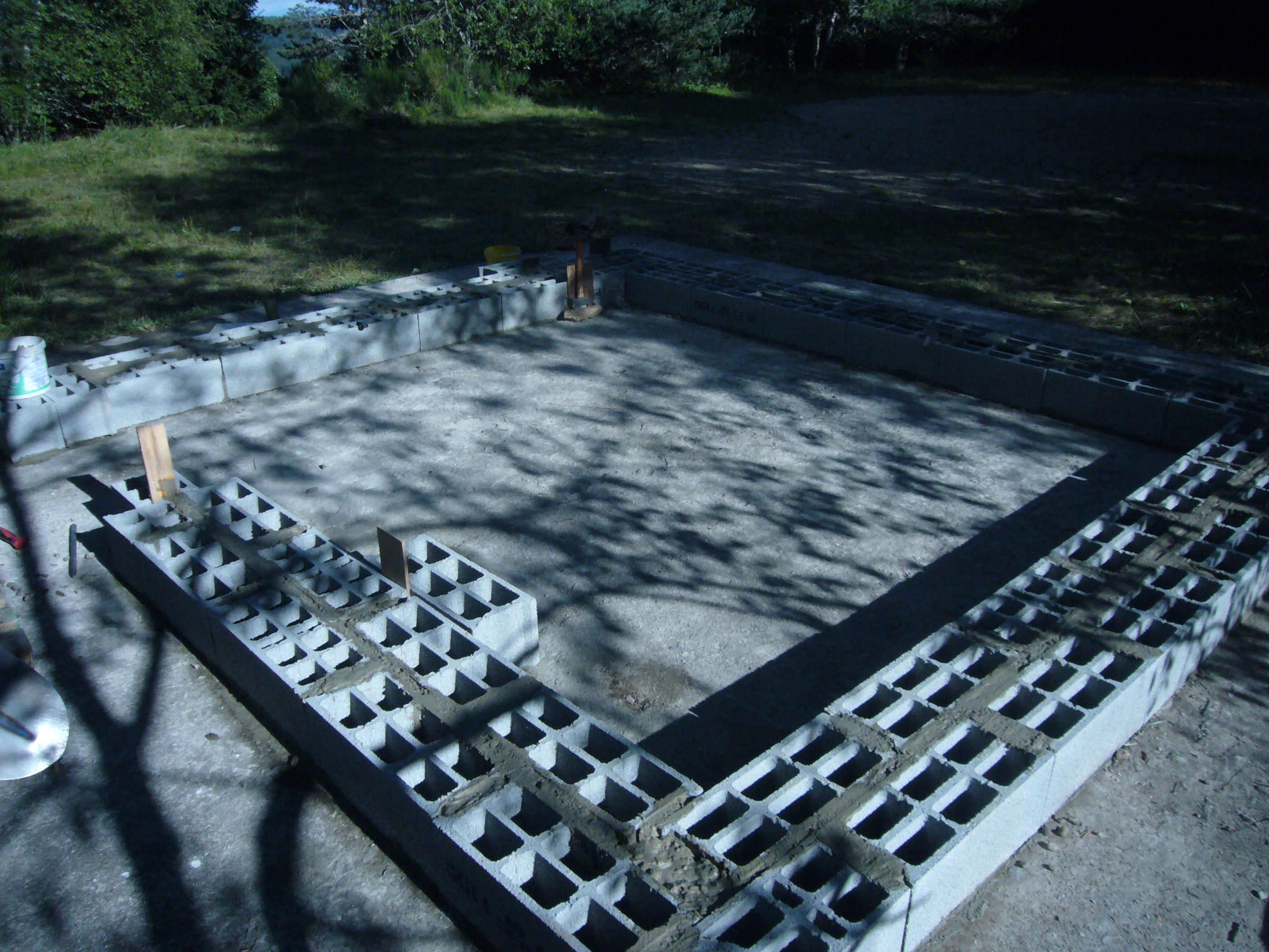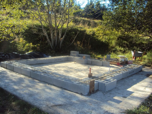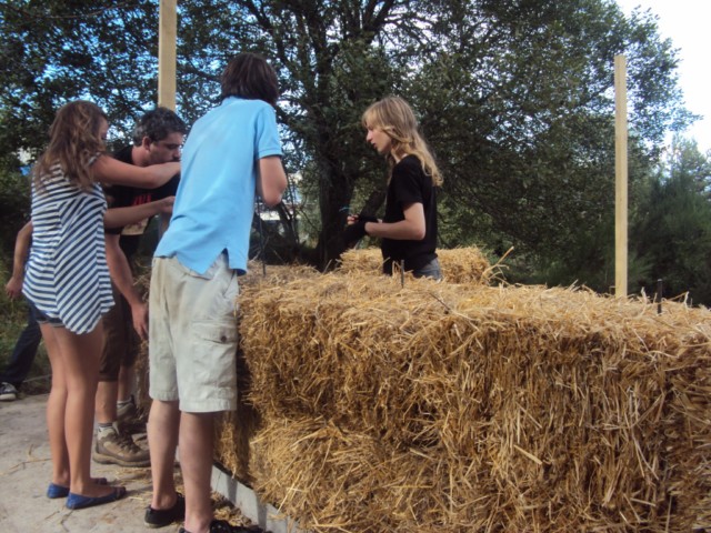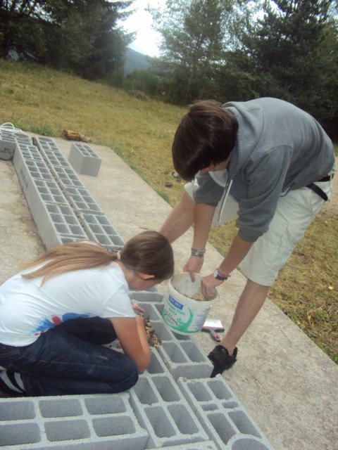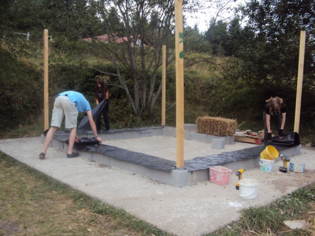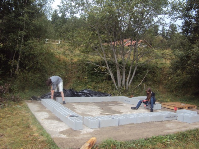 Nous avons continue la construction de la cabane… nous avons mis en place une ligne de briques en parpaings qu’on a colle avec de mortier (béton+sable+eau) que servira comme isolation de l’humidité du sol pour les bottes de paille. Apres nous avons laisse sécher le béton.