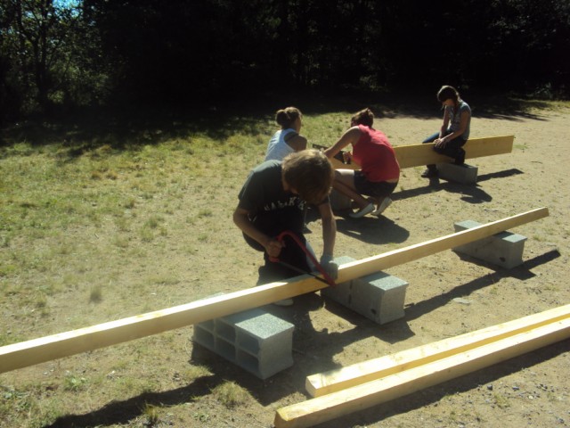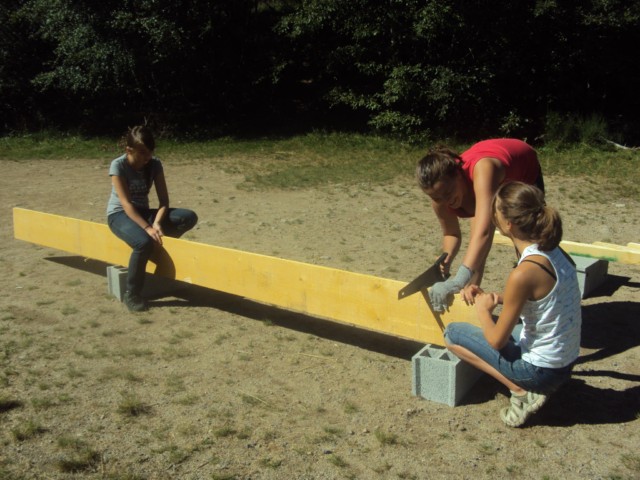 Le matin nous avons amené et coupé les poteaux et planches de bois, et l’après midi, après le goûter, nous avons assemblé une partie de la structure du toit et nous avons après vissé les attaches pour les quatre poteaux aux angles de la future cabane.
