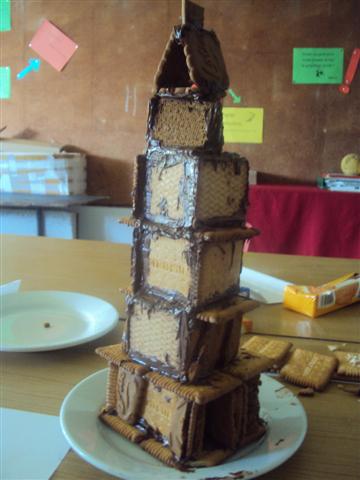 Ensuite on a utilisé seulement quatre biscuits pour chaque étage de la tour… on a réussi à faire 5 étages ! Pendant le dîner on a mangé notre tour avec les autres.