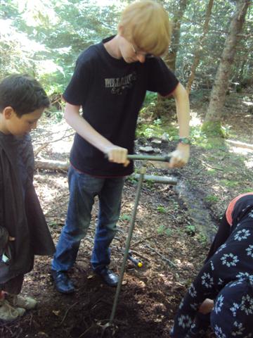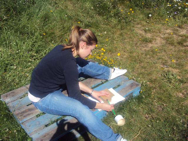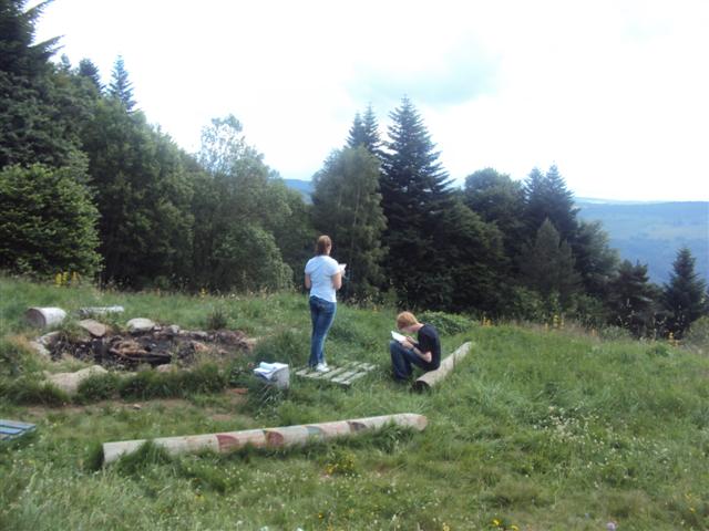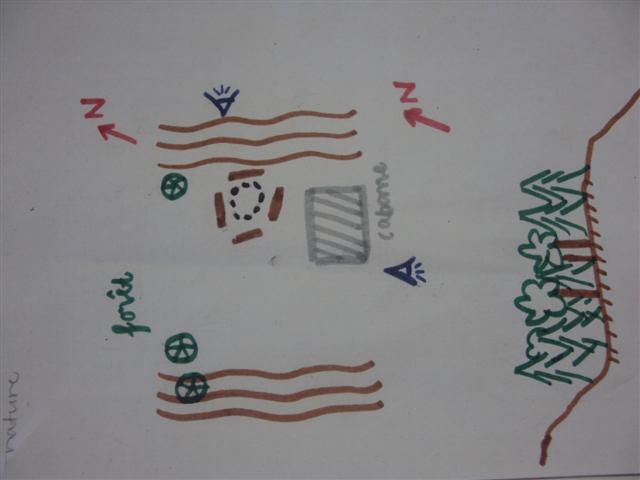 L’après midi nous avons fait une balade autour du Centre pour chercher un lieu pour proposer la construction d’une cabane écologique en nous aidant d’une boussole et de croquis (plan et coupe) du terrain.