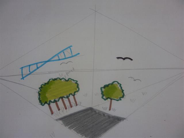 Pendant l’après-midi nous avons fait la perspective de la cabane, ensuite nous avons essayé la technique de l’aquarelle dans un paysage que nous avons dessiné. Après on va peindre notre perspective.