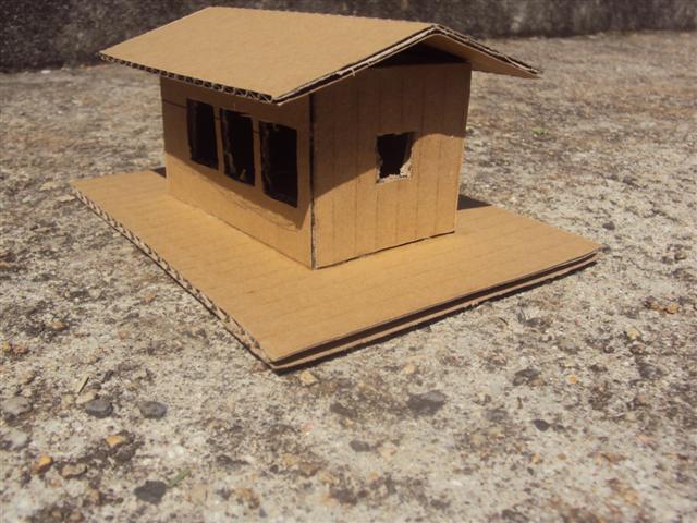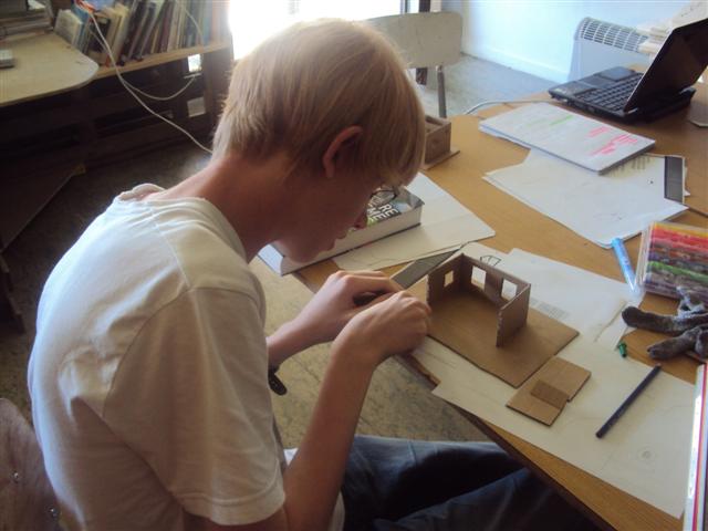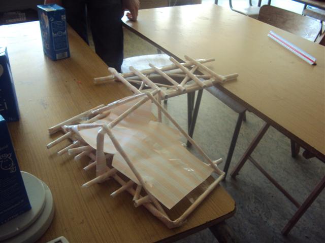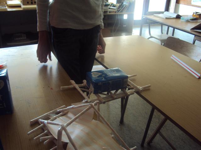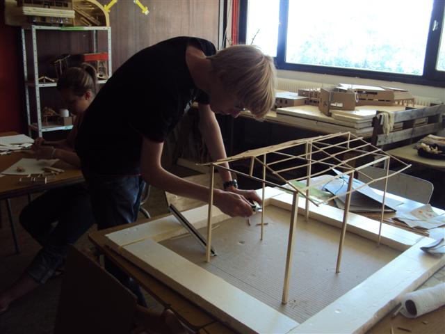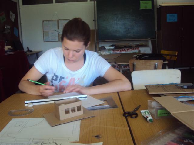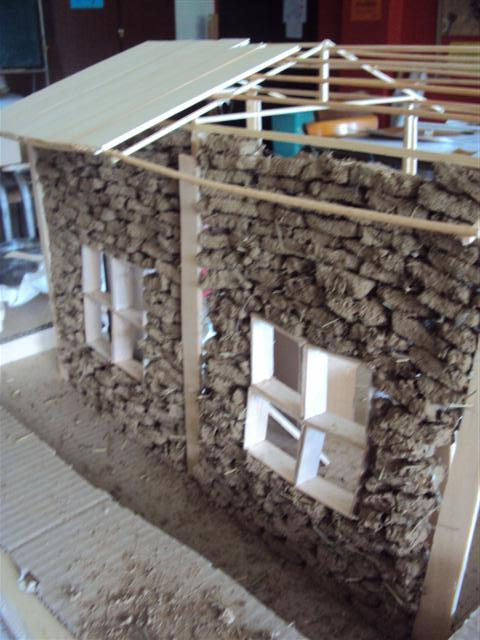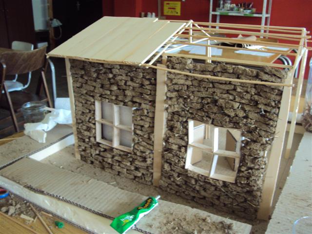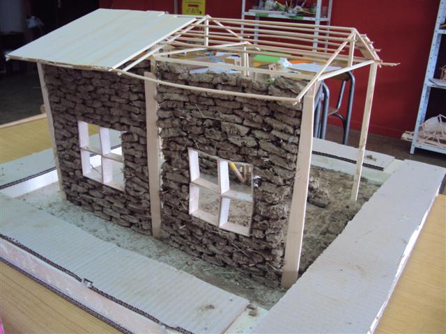 L’après-midi on a commencé à faire la maquette, nous avons débuté par la base faite en mousse et carton. Ensuite nous avons construit la structure de la cabane (poteaux, charpente) en bois balsa. L’échelle qu’on a choisie pour la maquette est 1 :10.