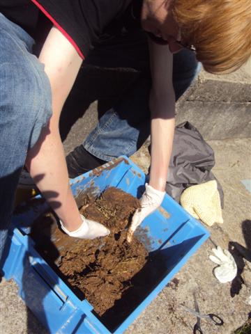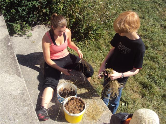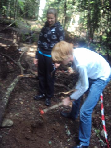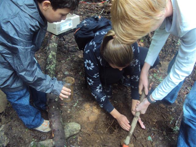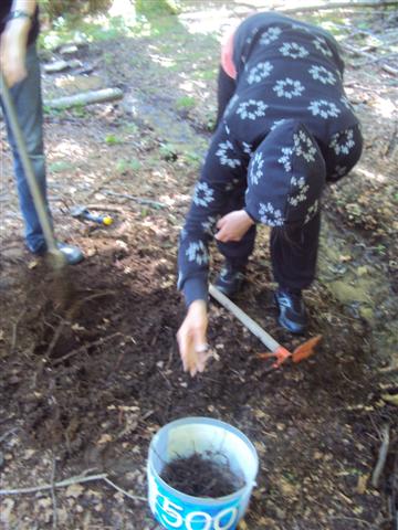 Après nous sommes partis dans la forêt pour chercher l’argile. Nous avons prix six différents échantillons de différents endroits près de la rivière qui est dans la forêt. Pour obtenir les échantillons nous avons creusé à l’aide d’une pelle et après nous avons gardé un peu de terre dans une bouteille.