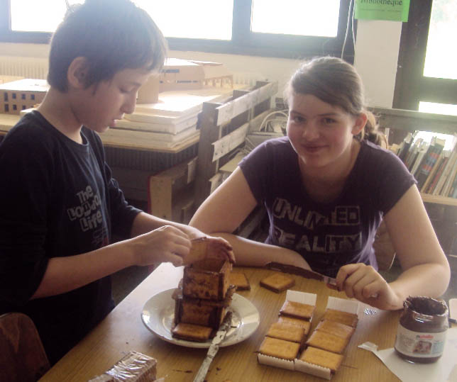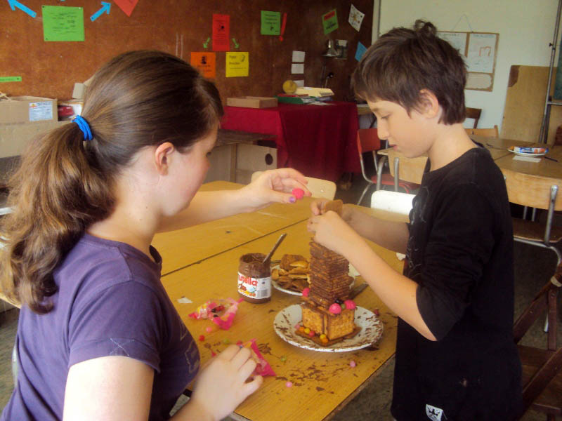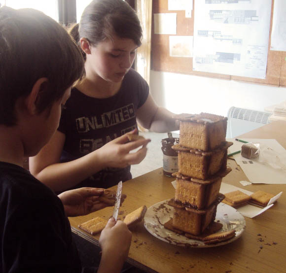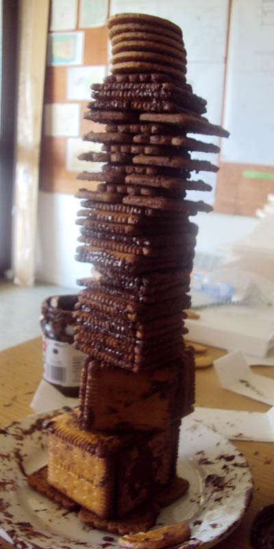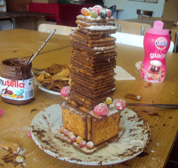Nous avons fait (Céline et moi, Victor) une tour en biscuit en se servant de Nutella comme colle, notre tour est tombé trois fois mais finalement on a réussi à faire un belle tour !!