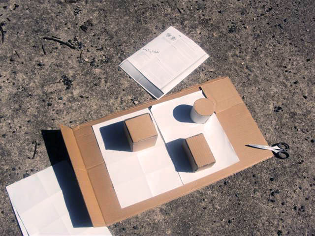 Pour choisir la forme de la cabane nous avons fabriqué un cube, un rectangle et un cylindre pour pouvoir tester l’ombre dans le terrain demain matin.