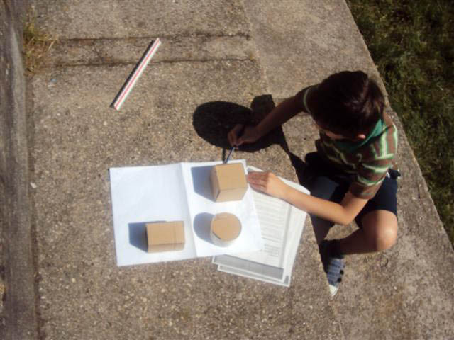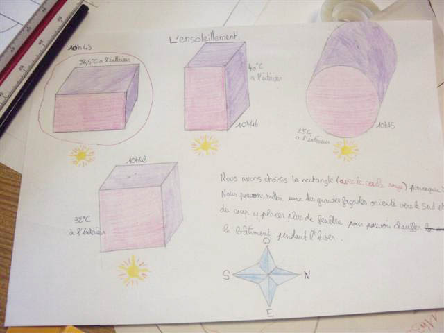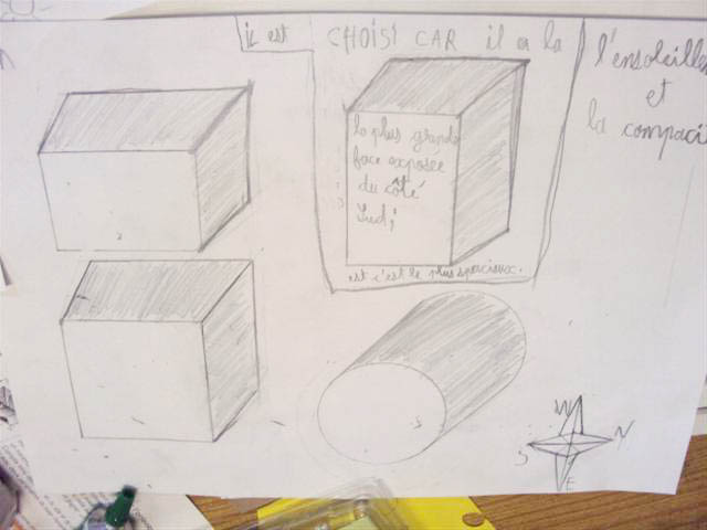 Aujourd’hui on a fini les maquettes de volumes. On est allé dans le terrain pour analysé les ombres, on a mit une feuille en dessous de chaque volume pour dessiner les ombres, on a situé aussi le nord et on a écrit l’heure.