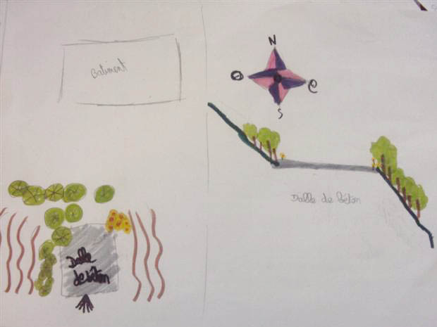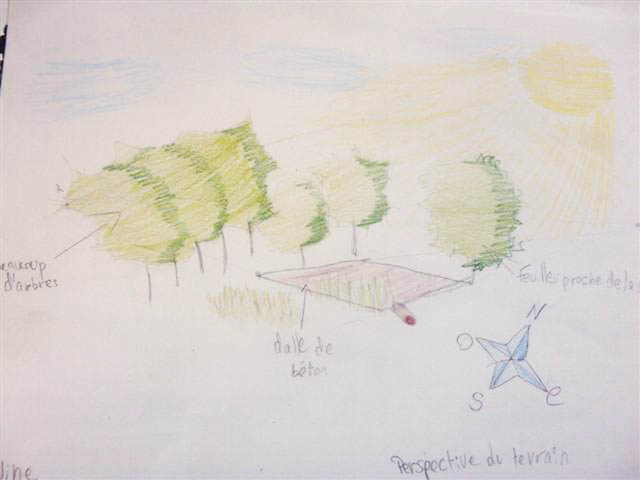 Dans l’après midi on a fait un tour autour du Centre pour chercher un site pour proposer la construction d’une cabane écologique. On a fait des croquis du terrain pour analyser :