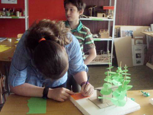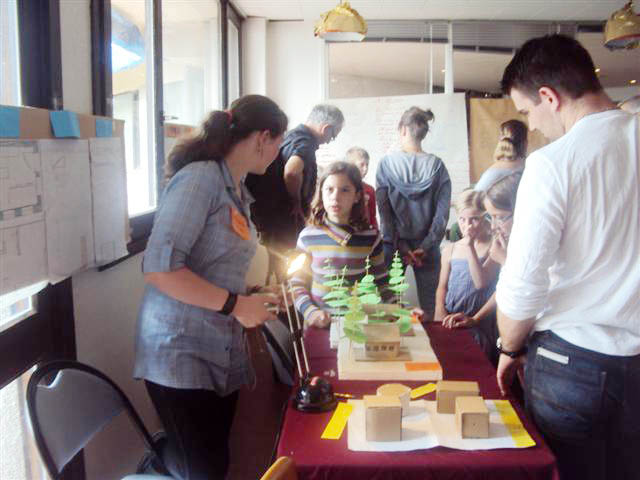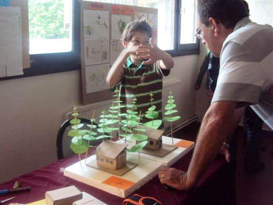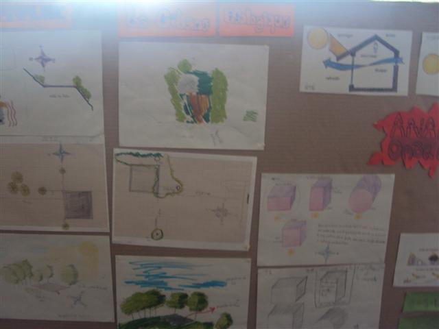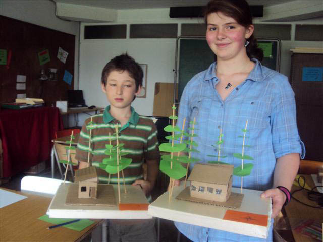 Pendant le matin on a préparé les posters pour la retransmission avec nos dessins. Ensuite on a fini nos maquettes, on a fait une base, ajouté des arbres et marqué le nord.