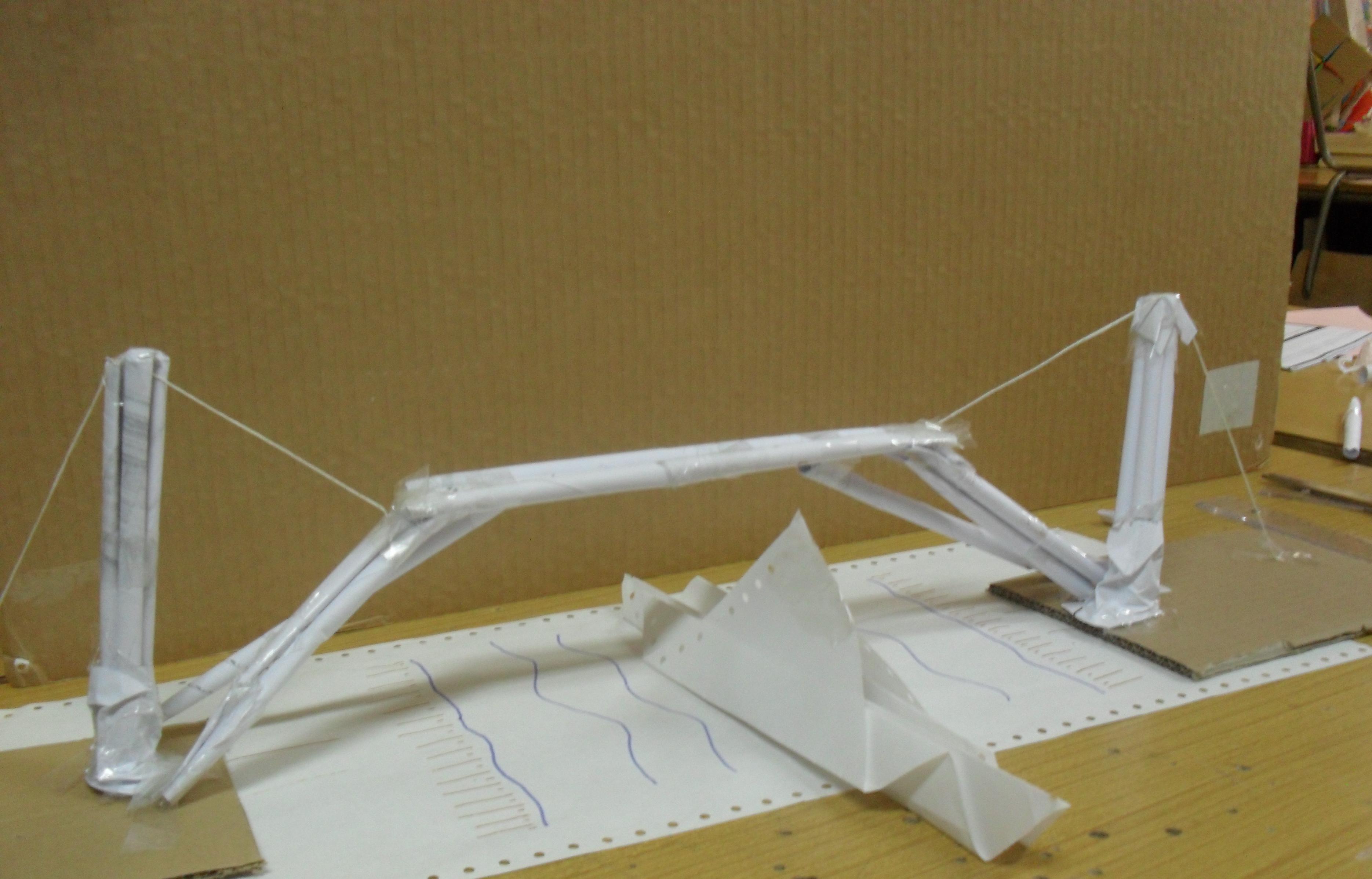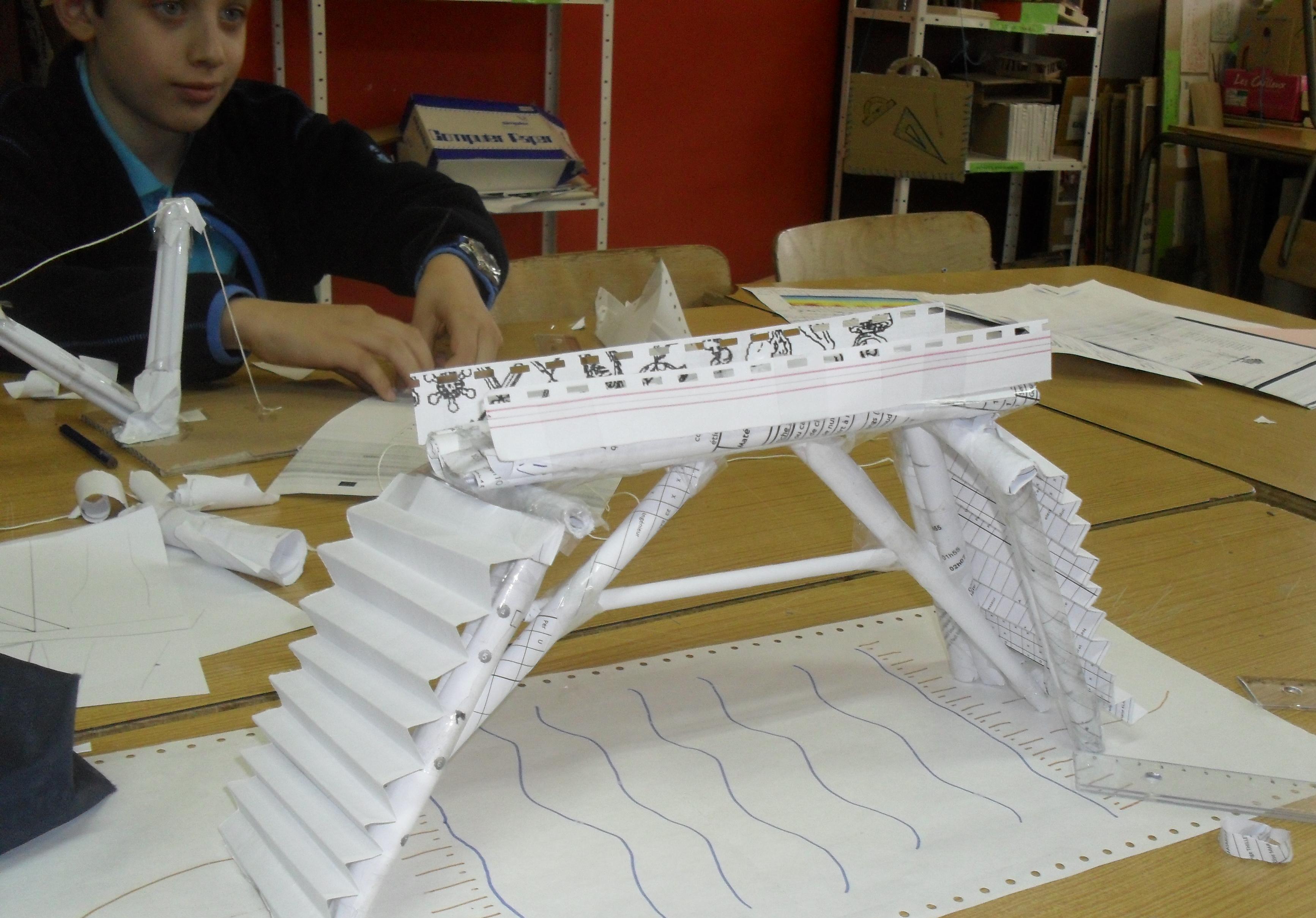 Ce matin après le forum, nous avons commencé les activités scientifiques par la phase contact. Nous avons du fabriquer un pont en papier de 9 cm de flèche et 25 cm de portée. L’idée était de réaliser une passerelle piétonne sur un chemin de randonnée. Ce pont doit laisser également passer les bateaux dessous.