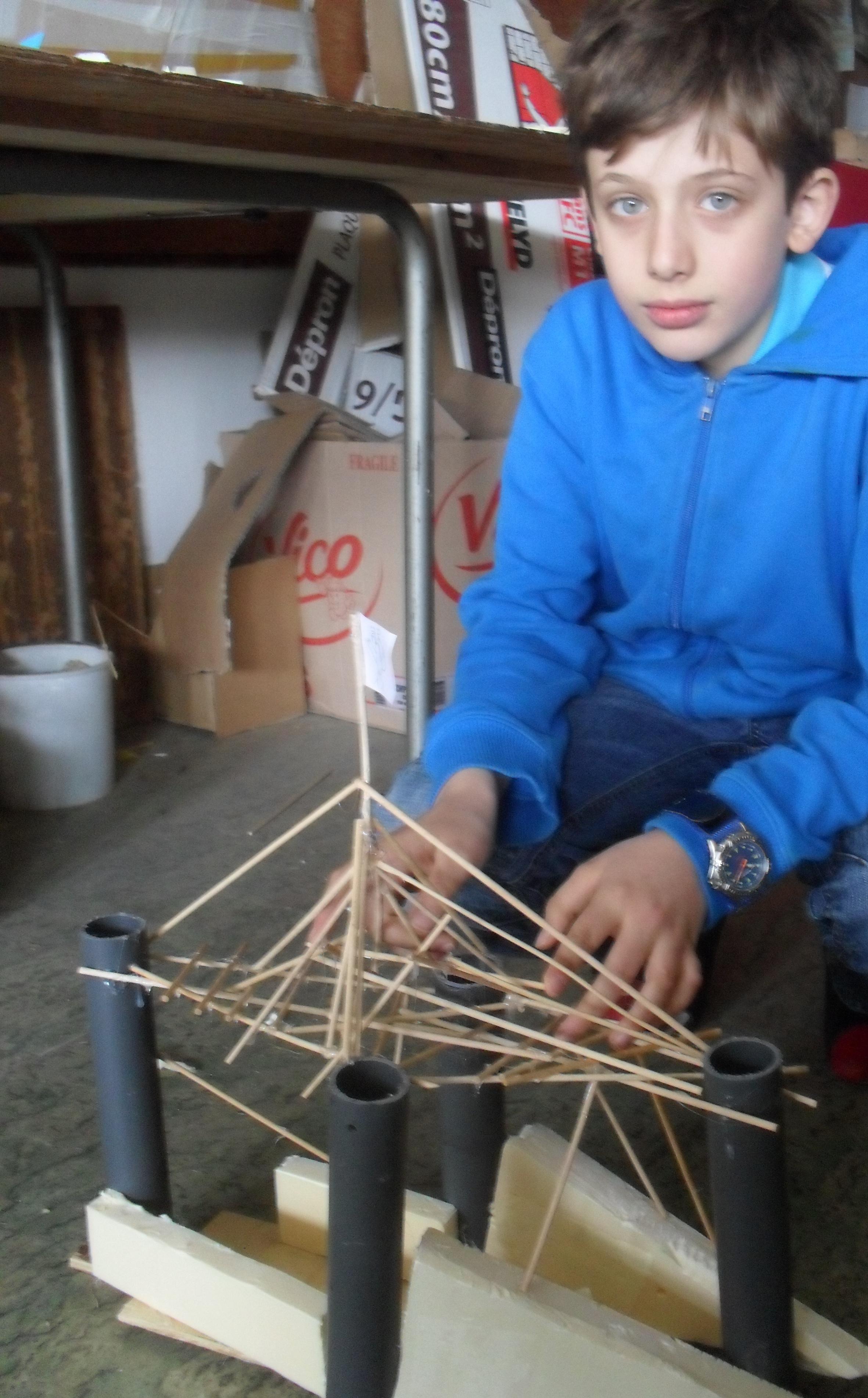 Aujourd’hui nous avons monté la partie arrière du dôme et nous avons ajusté les angles pour avoir une construction bien symétrique et correspondant au projet papier. Nous avons aussi fabriquer les diagonales des « écailles » rectangulaires. En Aes nous avons fait un rallye photo, deux équipes ont trouvés en entier la phrase mystère.