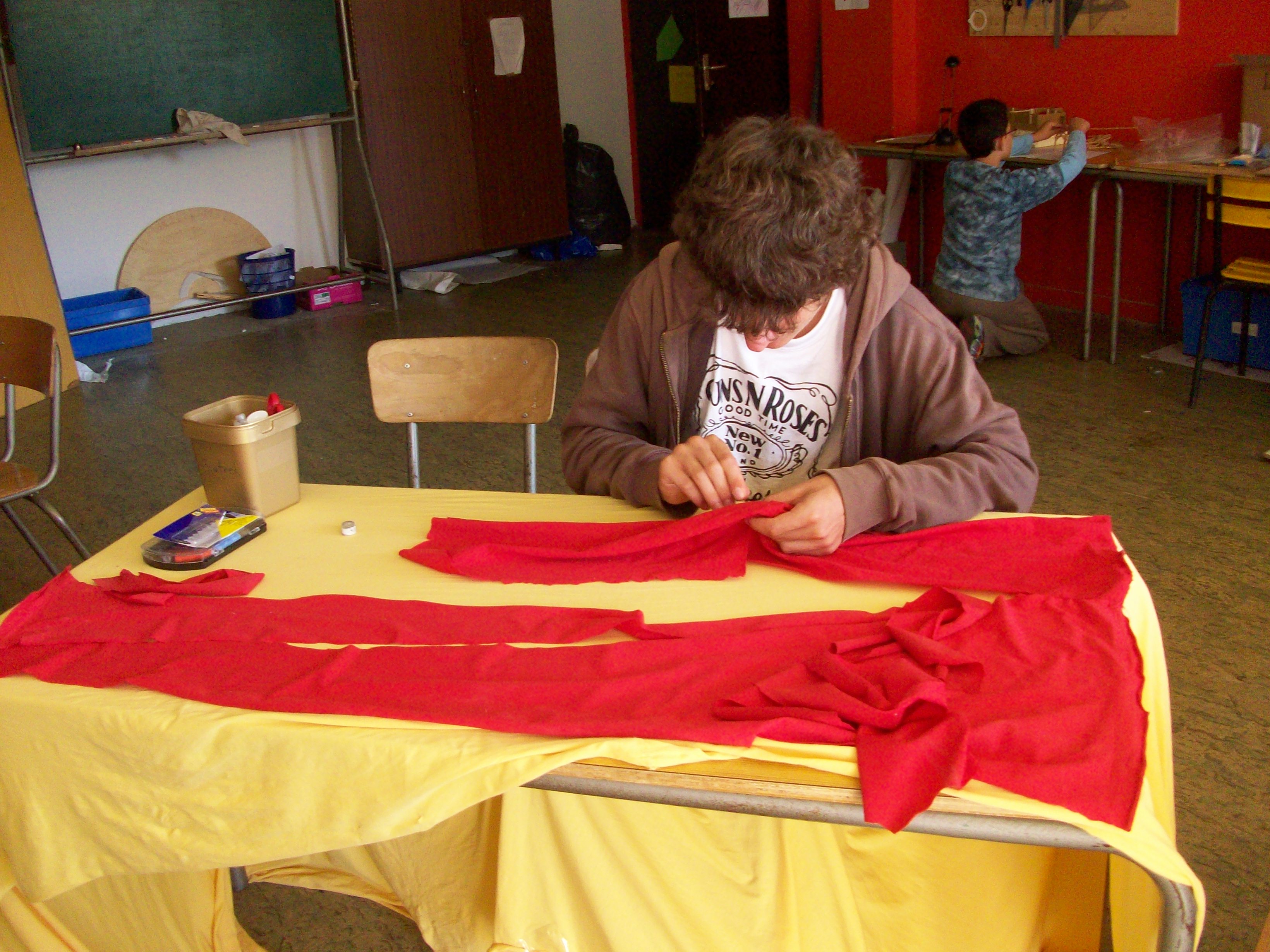 Lucas et Louise se sont occupés de récupérer les chutes de tissus restant du grand réfectoire, de les repasser et de commencer à les coudre de manière à confectionner un panneau acoustique.