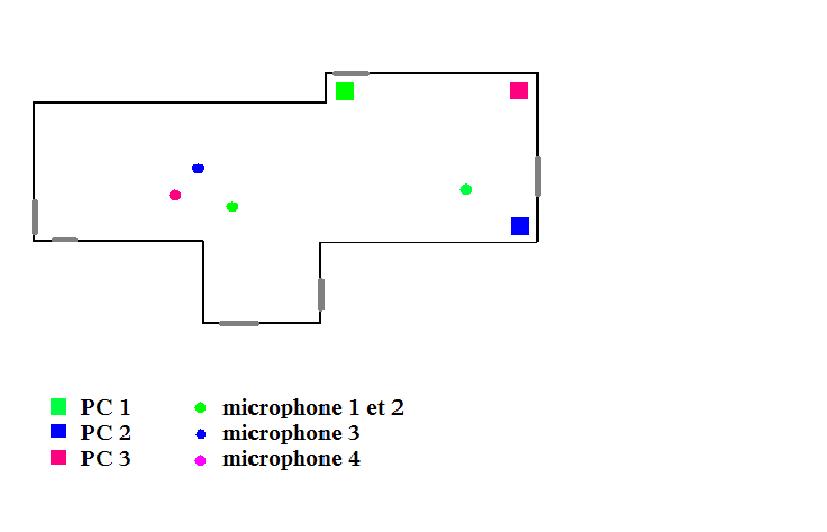 - Déroulement de la mesure : Comme indiqué dans la norme, on place la source sonore dans le coin formé par les deux murs contenant les fenêtres, orientée vers le mur, de manière à exciter au mieux le champ réverbérant. Avant d’actionner le bruit blanc, on réalise une mesure du bruit de fond. Le bruit blanc est activé, à une puissance sonore relativement élevée, puis coupée brusquement. L’acquisition du son par le microphone se fait du moment où l’on a actionné la source sonore, jusqu’à son extinction et environ 10 secondes après, le silence étant fait tout le long de la mesure. Pour une meilleure précision, il est nécessaire de réaliser la mesure plusieurs fois (environ 4). Le microphone est placé à 2/3 de la source par rapport à la plus grande diagonale de la pièce, selon la norme, à une distance d’environ 1m50 par rapport au sol.
