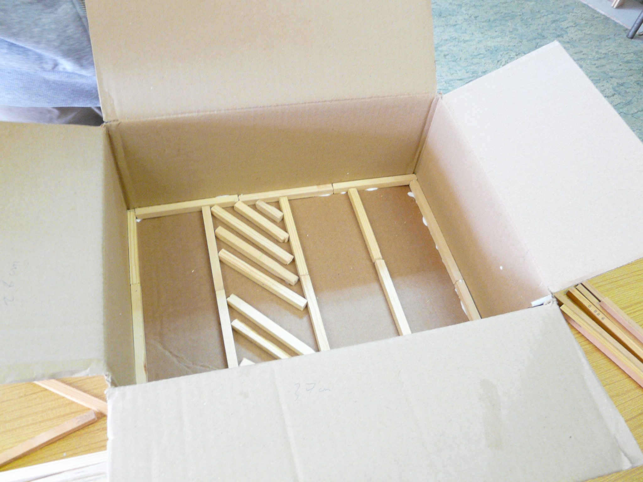 Test de la maquette avant la pose du liège sur les tasseaux de bois.