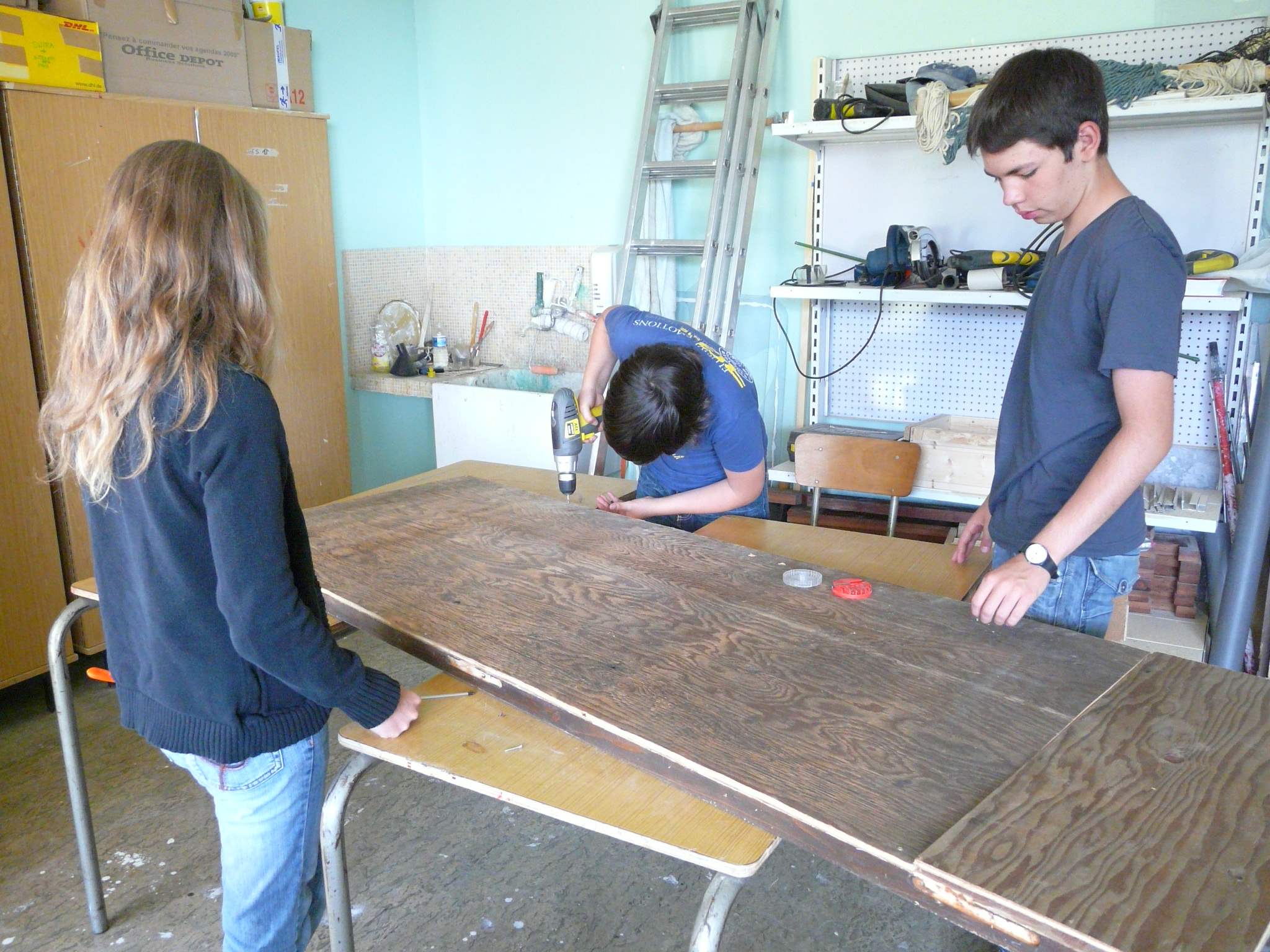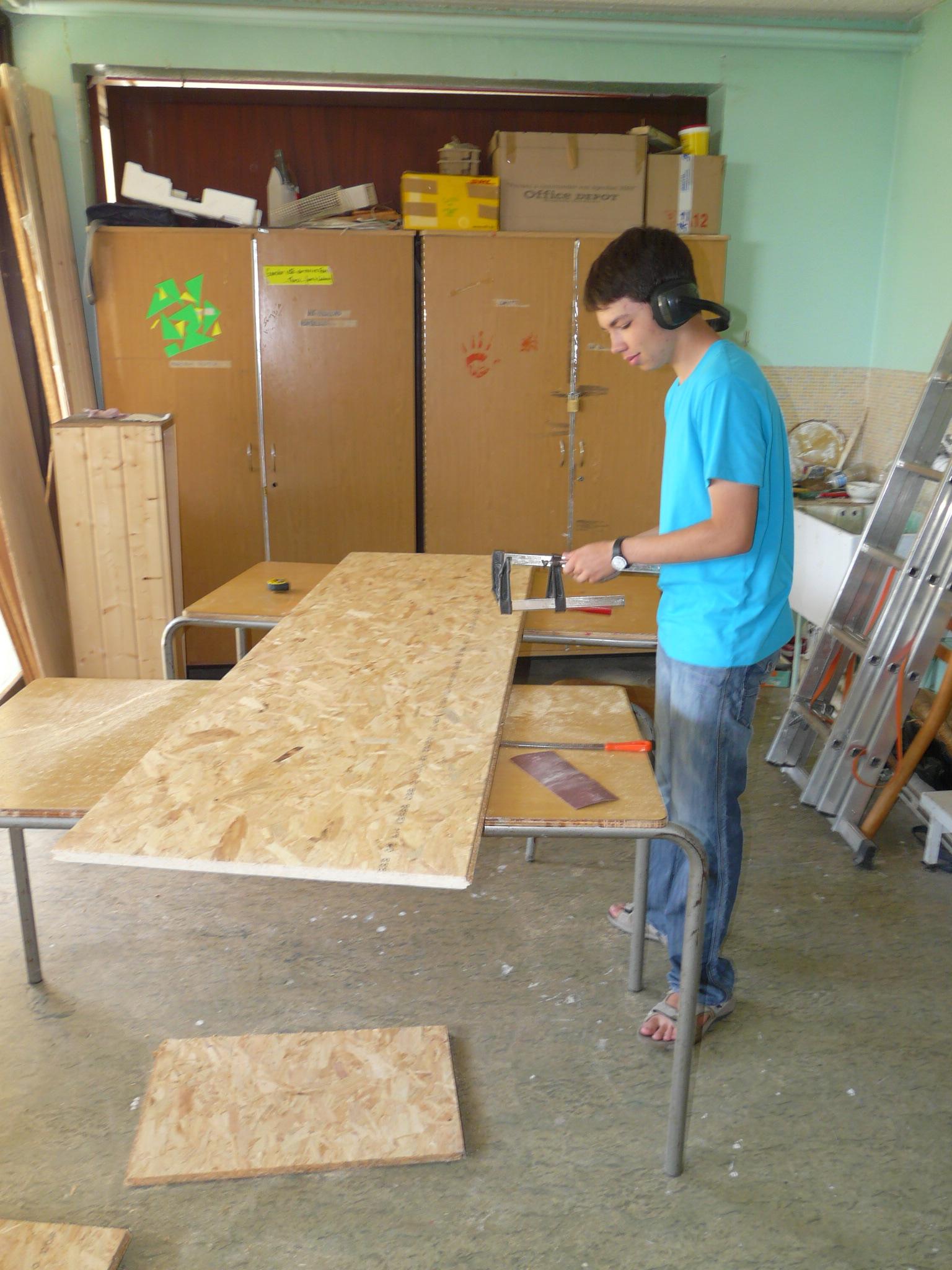 Notre objectif est d’insonoriser une pièce : on a commencé les travaux afin de faciliter cette tâche. On a posé un faux plafond de bois reconstitué à une hauteur de 2,12m à l’aide de tasseaux vissés dans le mur. Cela nous pris les 4h d’activités pendant lesquelles nous étions assistés par Patrick.