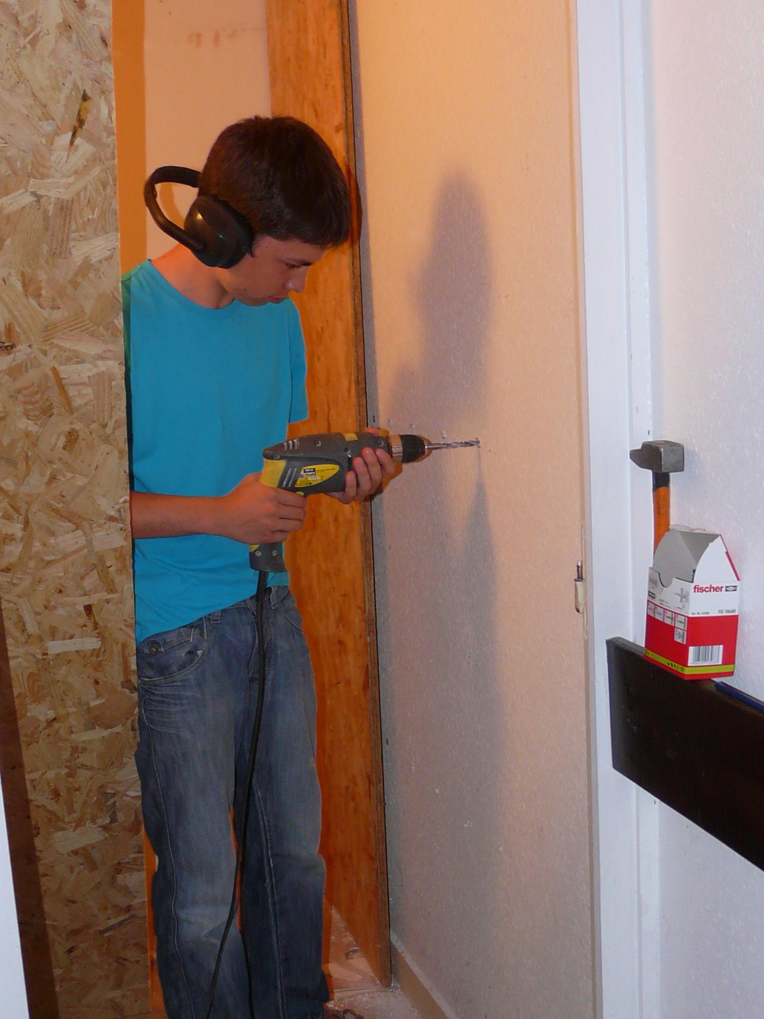 Après la finition des découpes des panneaux de bois, Mathieu s’est retrouvé confronté à un problème avec le dispositif de fixation des panneaux de bois sur les murs. Les chevilles choisi n’ont pas un pas de vis suffisamment long pour permettre l’écrasement de la laine de verre par le panneaux de bois lors du serrage.