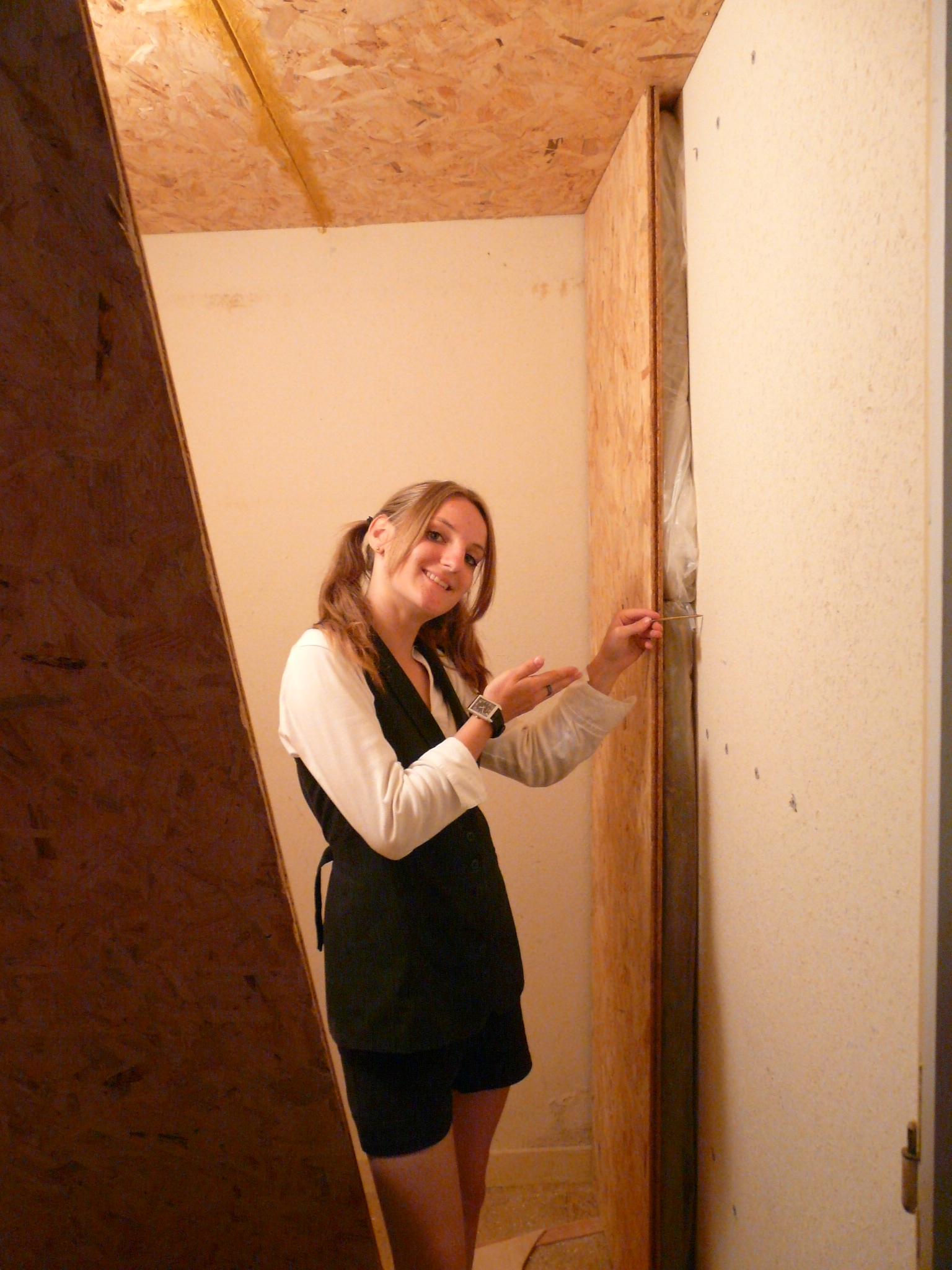 Ne trouvant pas de liège, l’équipe a du changer de solution technique. Au lieu de fixer du liège sur des tasseaux, la salle sera réalisé avec de la laine de verre placée derrière des panneaux de bois.