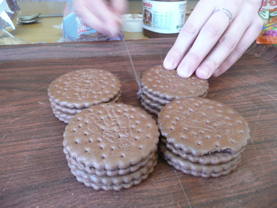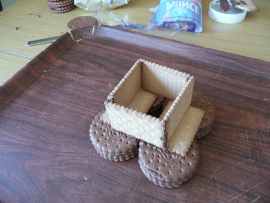 La deuxième étape consiste à réaliser la base de la tour. La base doit mesurer 15 x15 cm maximum. Les biscuits doivent être placés les uns à coté des autres et collés avec le caramel ou le miel. L’ensemble doit être bien solide.