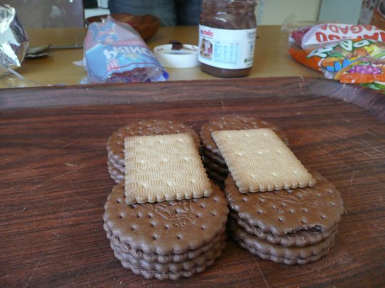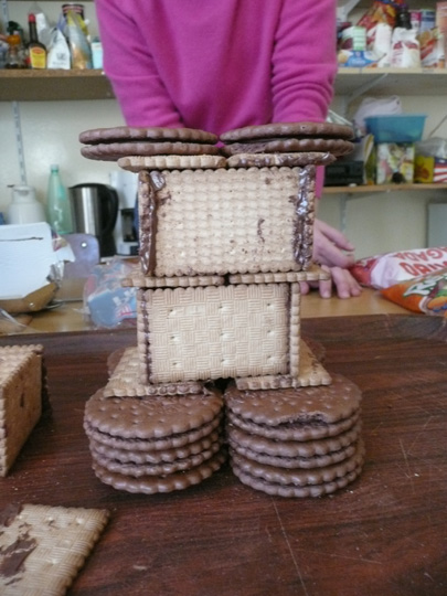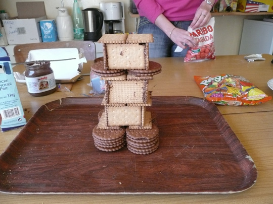 Il s’agit d’empiler et de coller un maximum de biscuits afin de réaliser la tour la plus haute. Chaque niveau doit faire un minimum de 8 x 8 cm. Les participants seront invités à diversifier les biscuits employés afin de garder un certain minimum dans la créativité associée à cette activité.