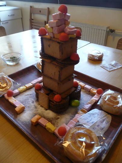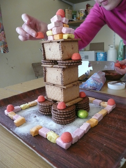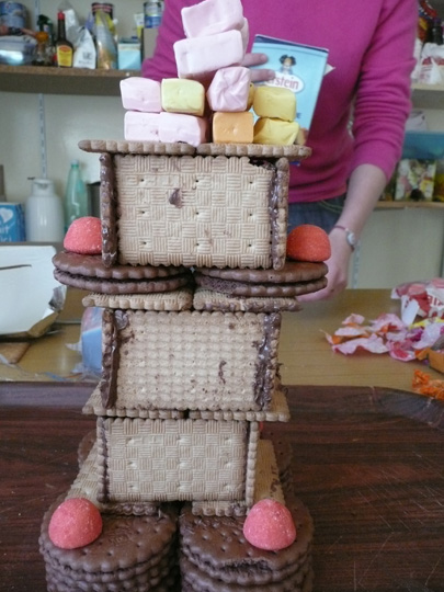 Une fois la tour terminée, il faut faire les alentours du bâtiment. Chaque équipe réalise des murets, des arbres, des personnages, des buissons, etc… à l’aide des bonbons et autres biscuits en chocolat. Chaque objet est collé avec le miel, le caramel ou par le glaçage.