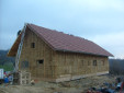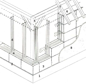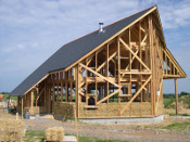 Les murs sont constitués d’une ossature bois ou d’un système poteaux-poutres. Les bottes sont utilisées comme remplissage isolant et non comme élément structurant. Cette méthode s’adapte plus facilement à différents styles architecturaux. De plus, en cas de dégâts, il est plus évident de faire les réparations. Et enfin, lors de la mise en oeuvre, la toiture peut être posée avant les bottes de paille et donc protéger le matériau pendant le chantier.