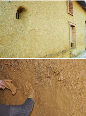 Après avoir assemblé les bottes de paille, suivant les deux techniques citées plus haut, il est nécessaire d’appliquer un revêtement sur celles-ci. Il existe trois types de revêtement : enduit en terre crue, crépis à la chaux et bardage en bois sur enduis en terre ou chaux. Tout d’abord, cela permet de protéger la paille contre les nuisibles et les infiltrations d’eau. Ensuite, il augmente la rigidité des murs. En effet, les murs en paille peuvent être comparés à des murs maçonnés constitués de grosses briques molles et recouvertes d’une peau dur qui reprend les différentes charges auxquelles la structure est soumise parce qu’elle est rigide. Seul, l’assemblage de ballots se déformerait. Le mur en paille est une structure complexe qui doit sa solidité à la combinaison de tout ses éléments. Le revêtement doit aussi être respirant pour permettre la régulation de l’humidité dans le mur. Les crépis au ciment sont déconseillés car ils ne possèdent pas cette qualité. Les enduits terre, quant à eux, sont particulièrement adaptés. Ils permettent au mur de respirer et ont une bonne capacité d’inertie thermique. Ils agissent comme des peaux vivantes et apportent un bien être dans le bâtiment. De plus, les enduits terre sont souvent réalisés à partir des terres d’excavation du chantier. Ce qui signifie qu’il n’a besoin d’aucun transport pour les acheminer ou les évacuer.