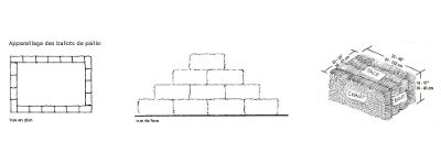 Pour commencer, il ne faut pas confondre paille et foin. La paille est la partie entre l’épi et la racine des graminées, en d’autre terme la tige. Le foin est composé de la tige et des fruits des céréales. Il attire les insectes et pourri plus facilement. Il est destiné à la nourriture des chevaux tandis que la paille est un sous produit de notre production alimentaire. Celle-ci est utilisée en ballot, assemblage de paille compressée lié en bloc. Ils se déclinent sous différentes formes.Pour avoir de bonnes bottes de paille en construction, il faut qu’elles soient bien sèches, de dimension semblable, suffisamment compressées et composées de tiges fortes et flexibles. Les bottes doivent être assemblées comme les murs de briques( voir schéma).En général, elles sont montées à plat, c’est-à -dire avec les grandes faces horizontales et les petites faces verticales.Parfois, elles peuvent être disposées sur la face plus étroite, on dit qu’elles sont montées sur chant. La paille a quelques ennemis. Le premier est l’humidité. Il faut donc prévoir un lieu à l’abris de l’eau pour la transporter et la stocker sinon elle pourrira. Le deuxième, sont les nuisibles(rongeurs, insectes...). Il faut vieller à fermer tout les points d’accès possibles à la paille durant toutes les étapes du chantier. Et le troisième est le feu. Lorsque la paille est compressée, elle possède une bonne résistance au feu, meilleurs que certains matériaux traditionnelles. Il faut,cependant, être vigilant à la paille hors des ballots.